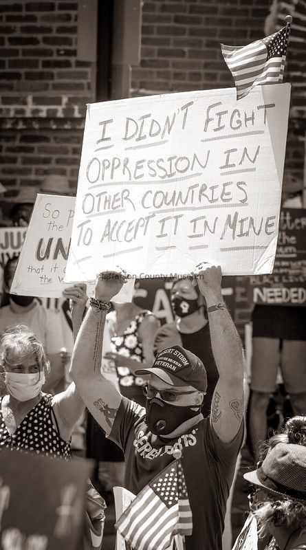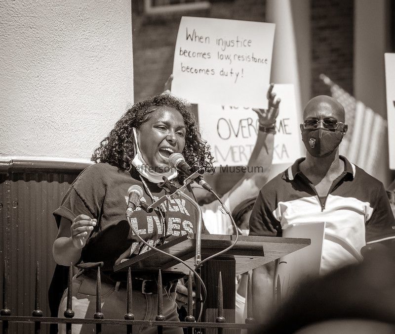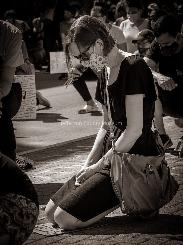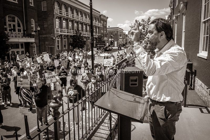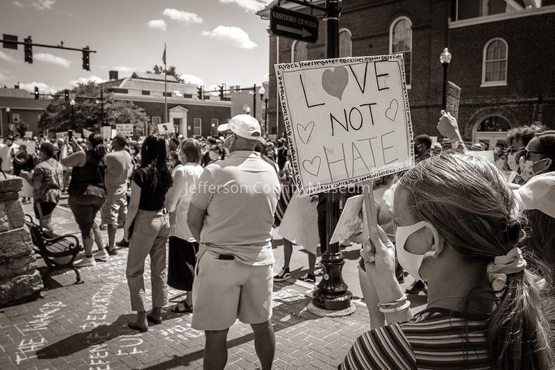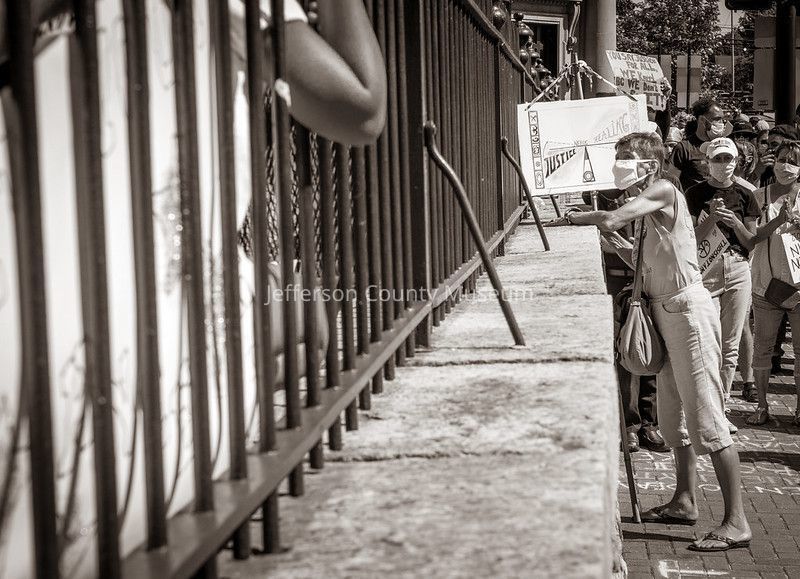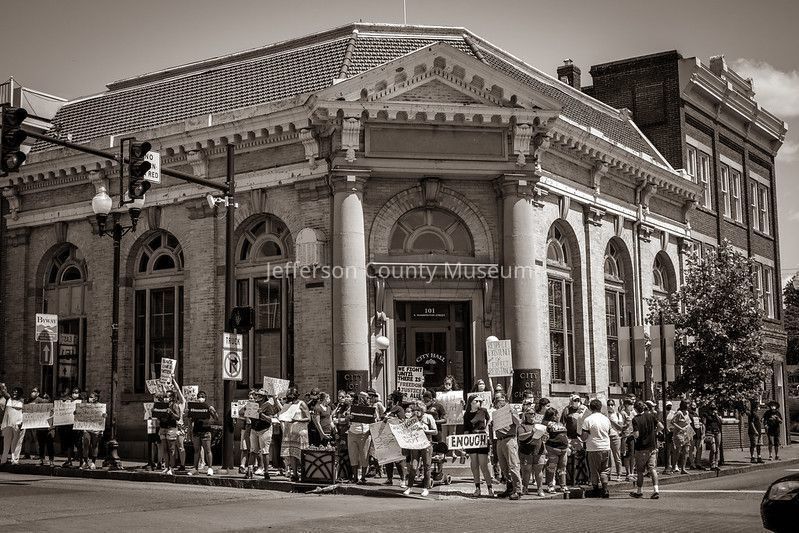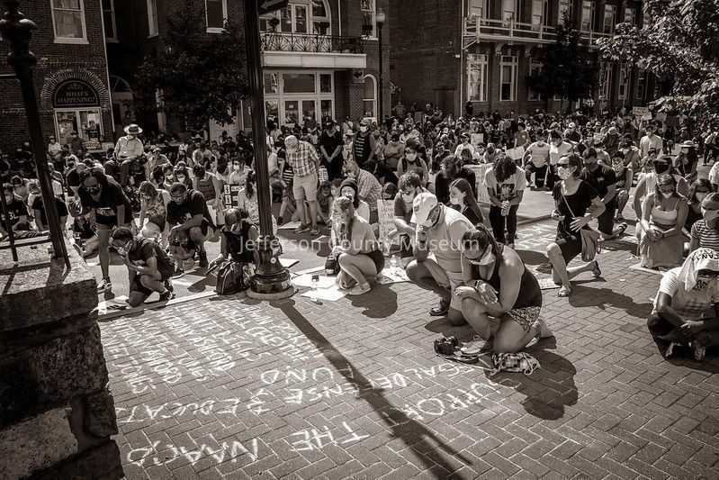 NAACP Black Lives Matter rally at intersection of George Street and Washington Street in Charles Town, on June 7, 2020. Crowds in front of Jefferson County Courthouse and Charles Town City Hall. Many individuals wearing masks due to COVID-19 pandemic.Acquisition