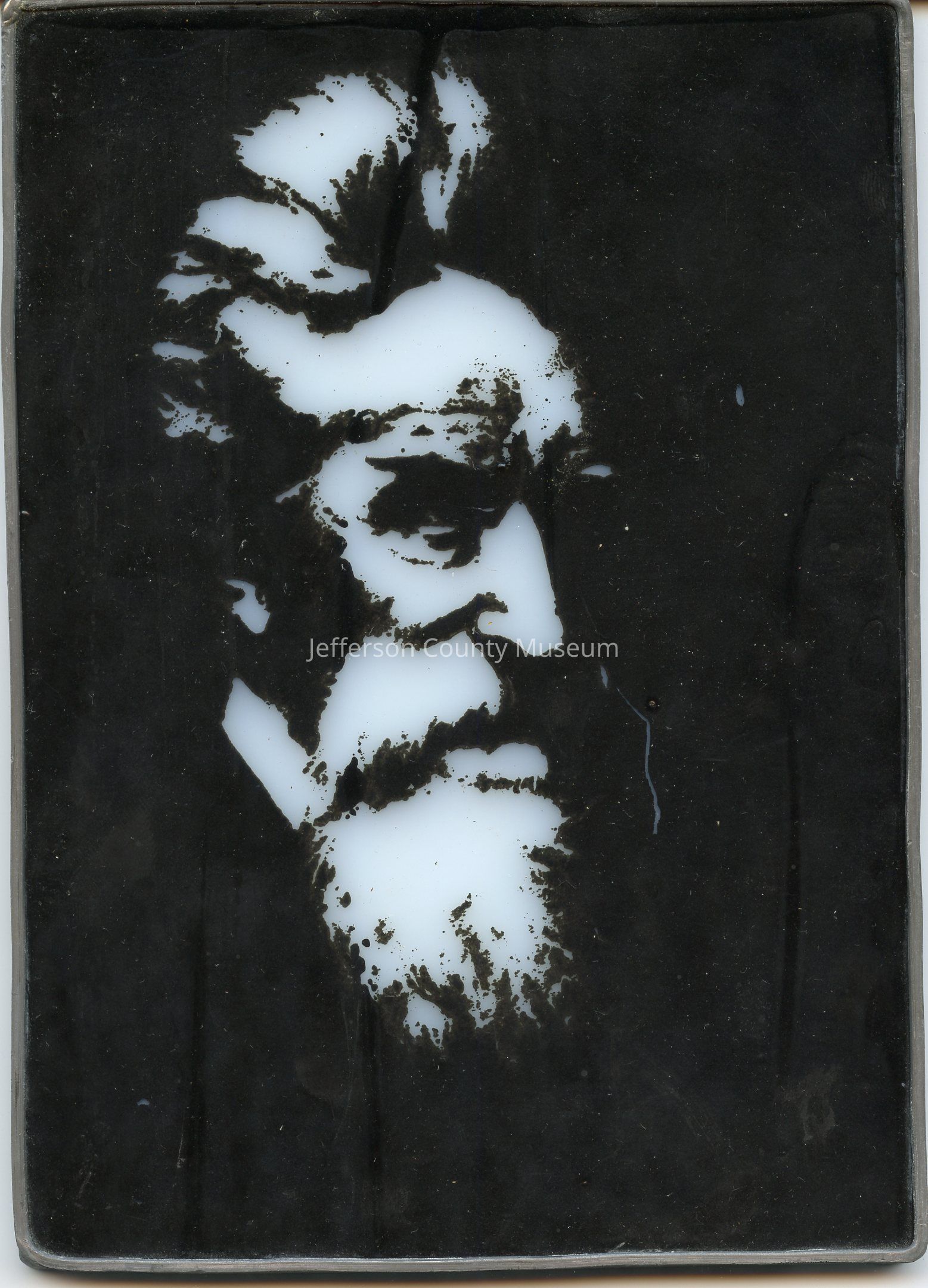 John Brown. Black paint on white opaque glass surrounded with lead came.