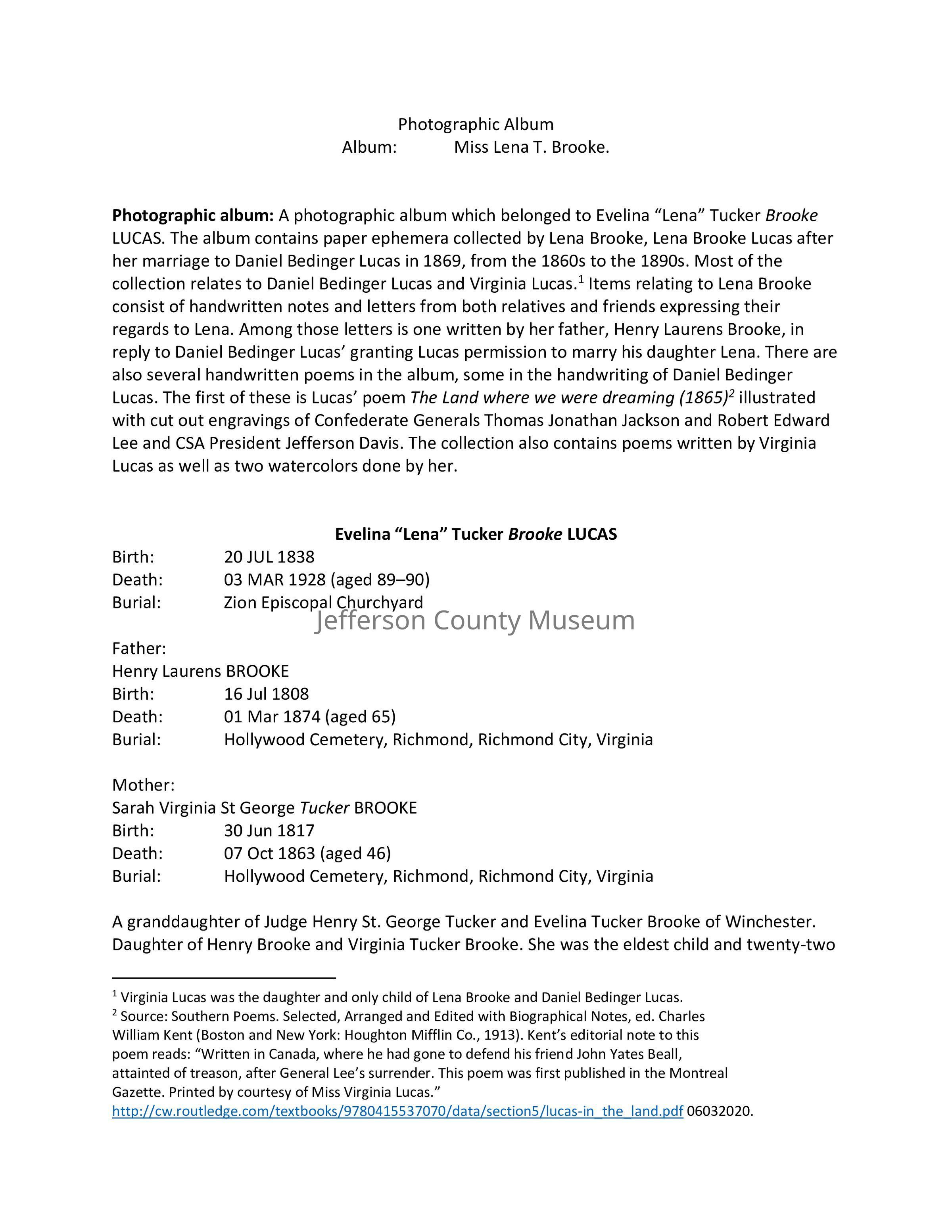 An album of materials collected by Evelina "Lena" Tucker Brooke Lucas (1838-1928) from the 1860s to the 1890s. She married Daniel Bedinger Lucas in 1869. Most of the collection relates to Daniel Bedinger Lucas and Virginia Lucas (1871-1929), daughter of Daniel B. Lucas and Evelina Tucker Brooke Lucas. Items relating to Lena Brooke consist of handwritten notes and letters from both relatives and friends expressing their regards to her. Items relating to Virginia Lucas include poems she wrote and watercolors she painted.