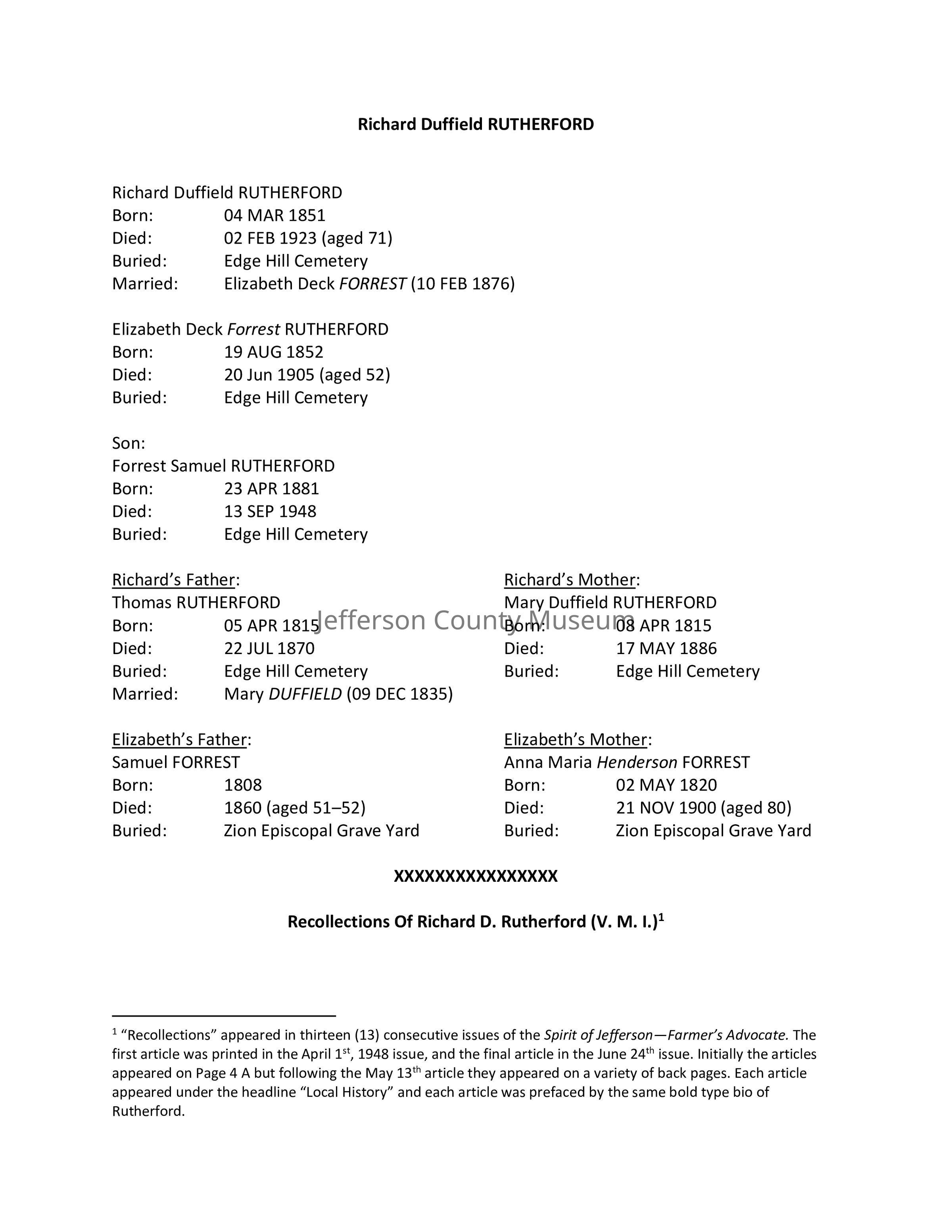 Richard Duffields Rutherford was born in the Old Rutherford home opposite the Inn. He married Elizabeth Deck Forrest, the daughter of Samuel and Anna Henderson Forrest (the latter a long time resident of Charles Town until her death here). Mr. Rutherford moved with his family to Council Bluffs, Iowa, in 1889. He later lived in Denver and died at the age of 74 in Indianapolis in 1923 at the home of his son, Richard, Jr.