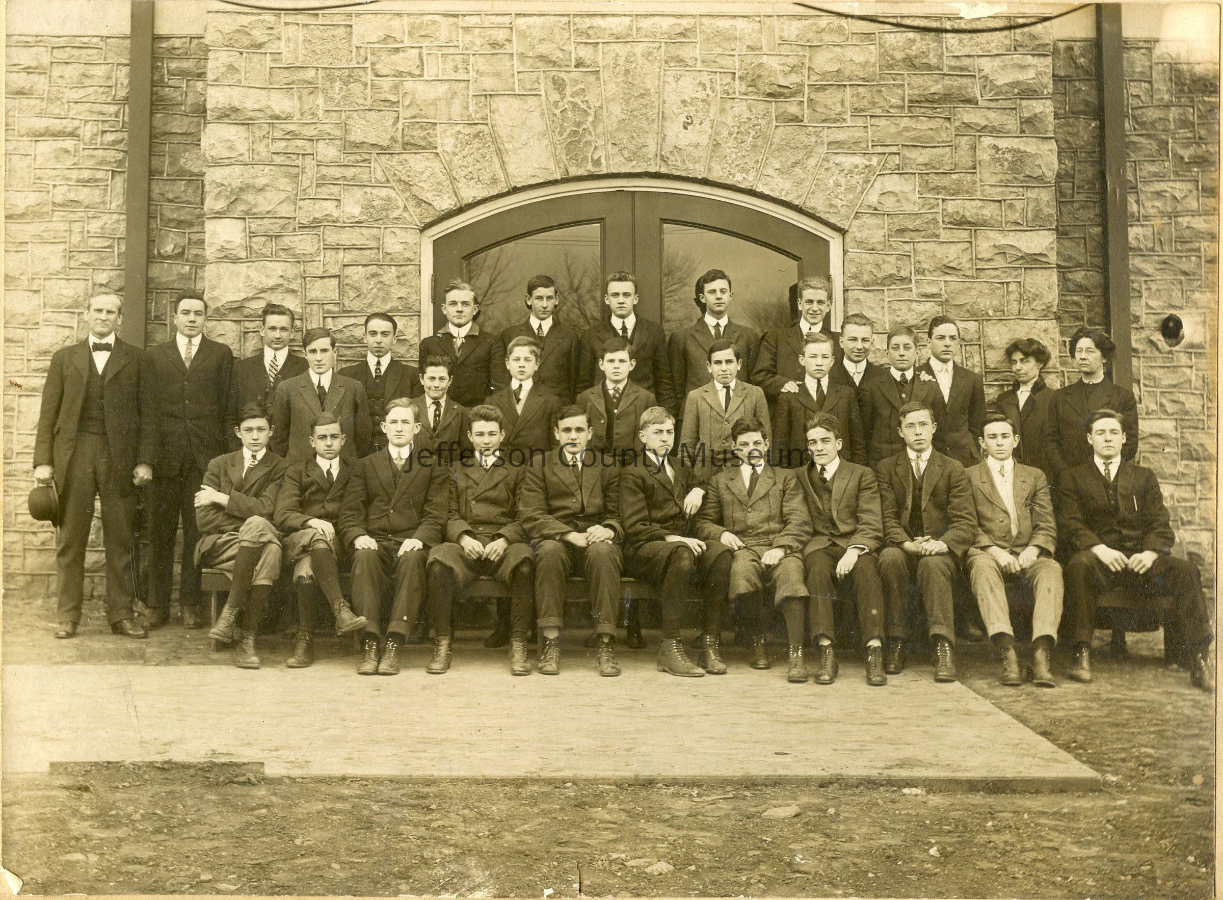 Boys and teachers (2 women) in front of school. Written on back: Boys High School. 1913-14. Taken Feb 2, 1914 9:45 A.M. John S. Coleman, front row, 5th from left Ranson, Charles Town High School. On cardboard.Acquisition