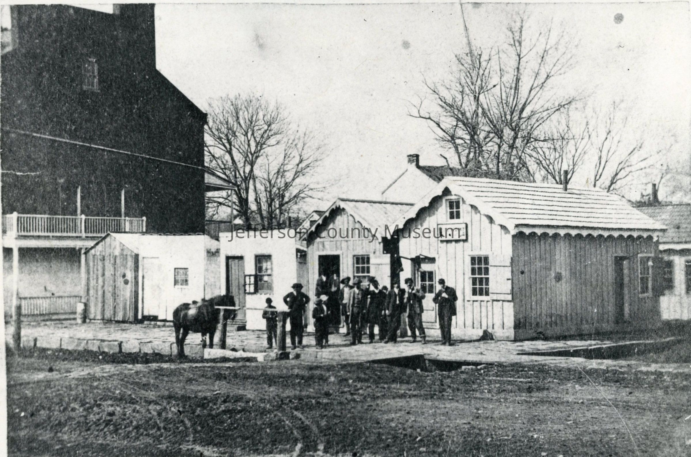 Northwest corner of George and Washington Streets. The original Market house on this corner was destroyed during the Civil War. Pictured here are temporary commercial buildings which occupied the site until Charles Washington Hall was built in situ in 1874.