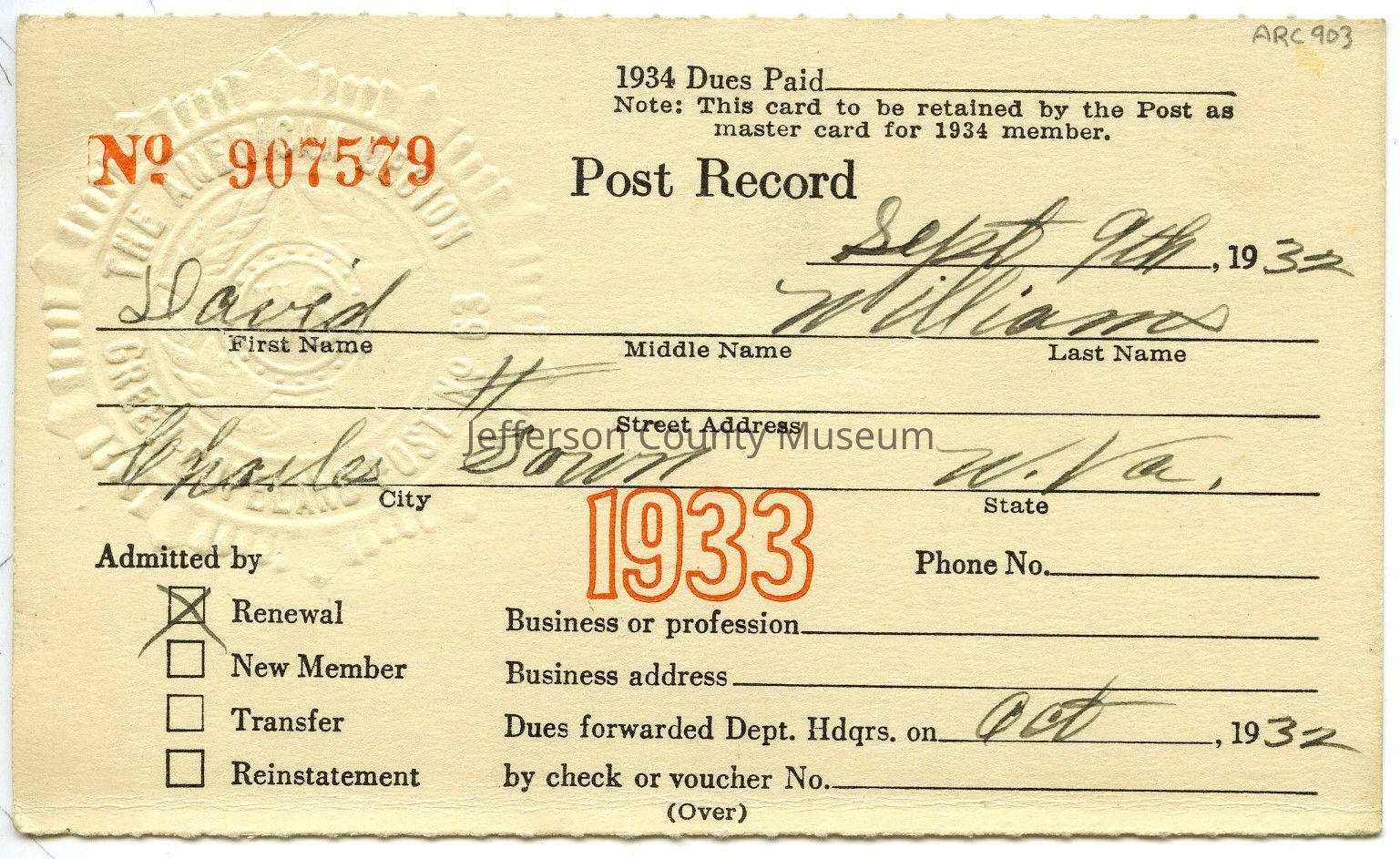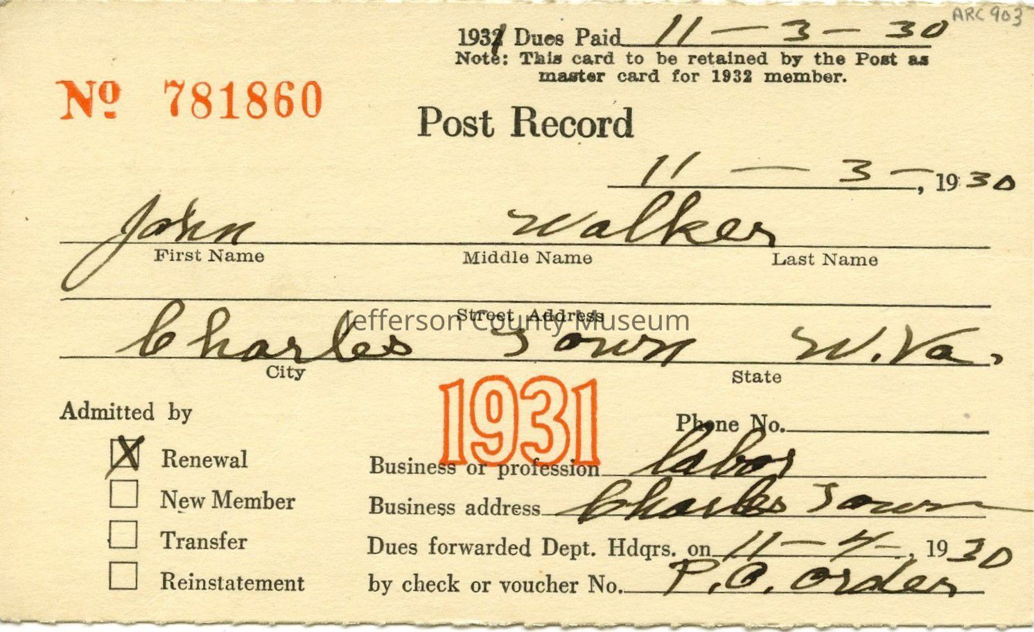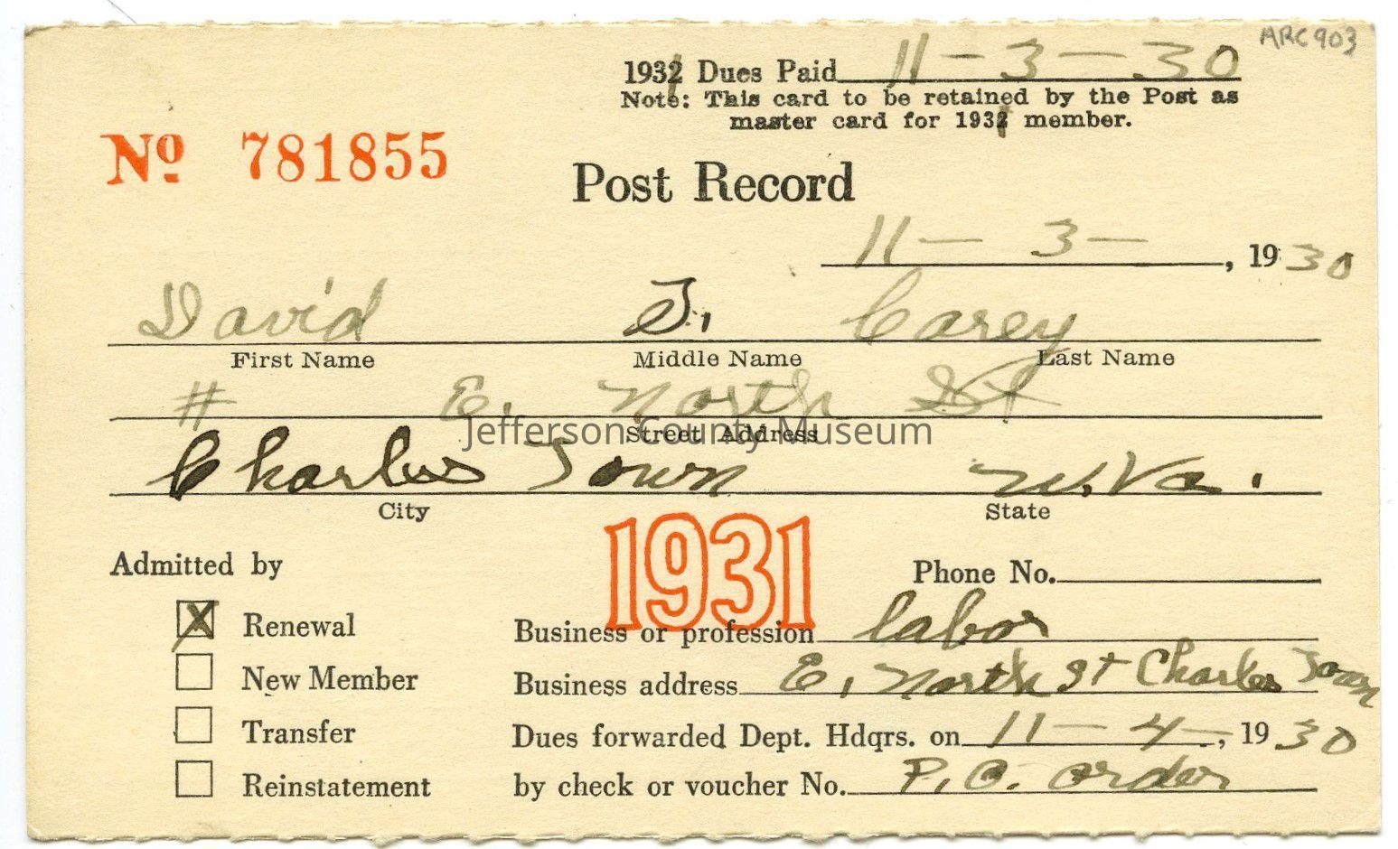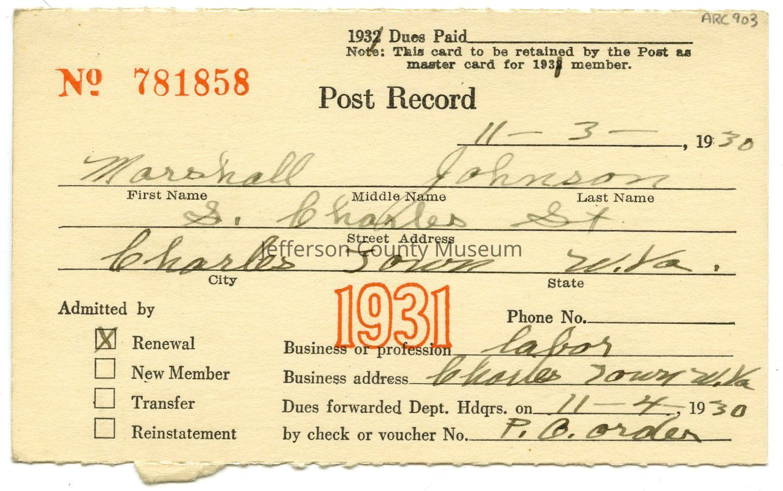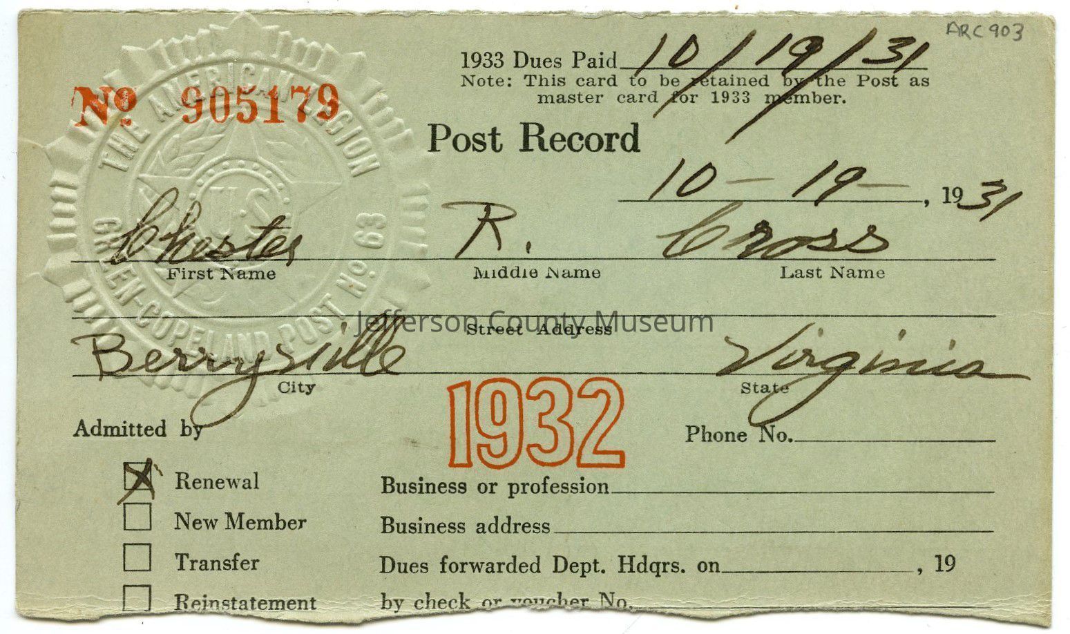 Twenty-nine post record membership cards for the African American American Legion Post in Charles Town: the Green- Copeland American Legion Post 63. The cards contain members' name, address, business or profession, business address, and dues paid. Each card has a box to check indicating if the member was admitted by renewal, new member, transfer, or reinstatement. In the top left corner printed in orange is a unique membership number. Dates for the cards range from 1930 to 1933.
