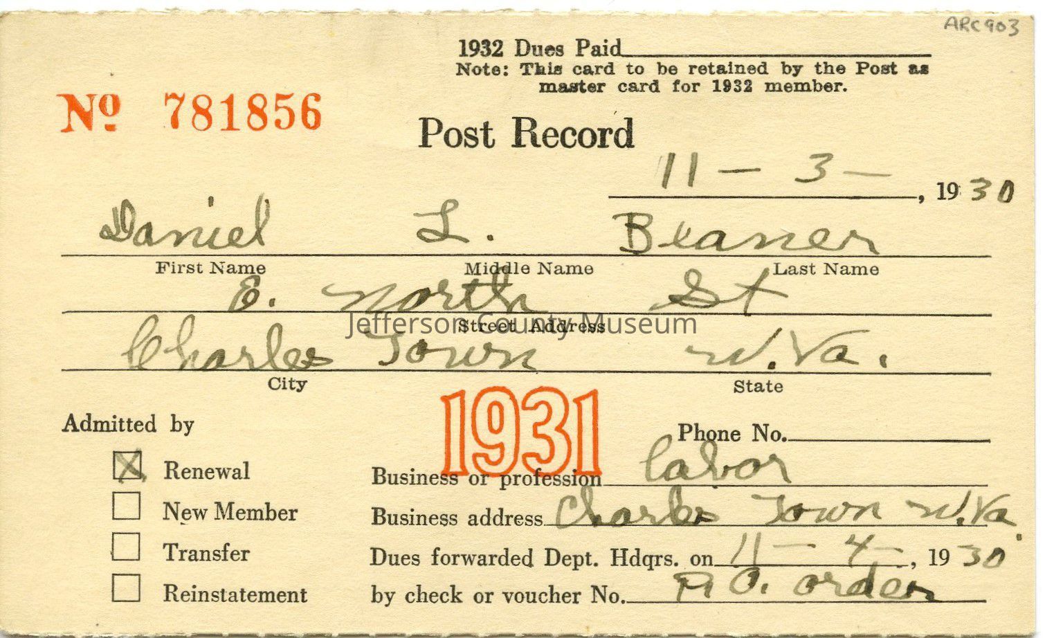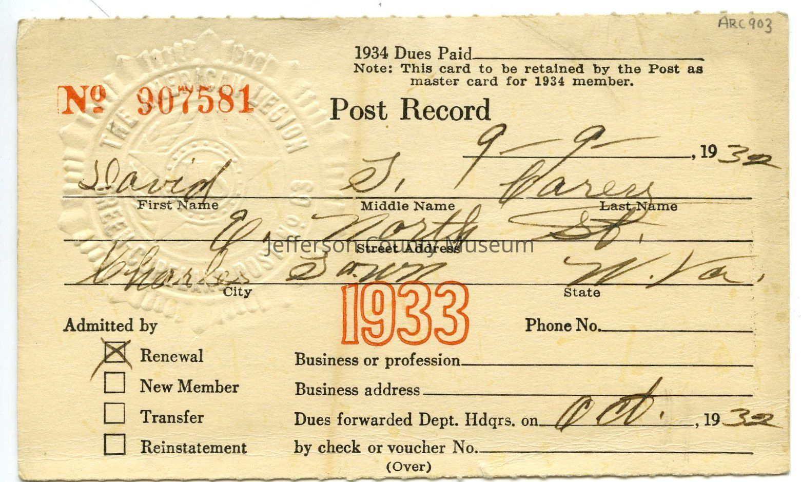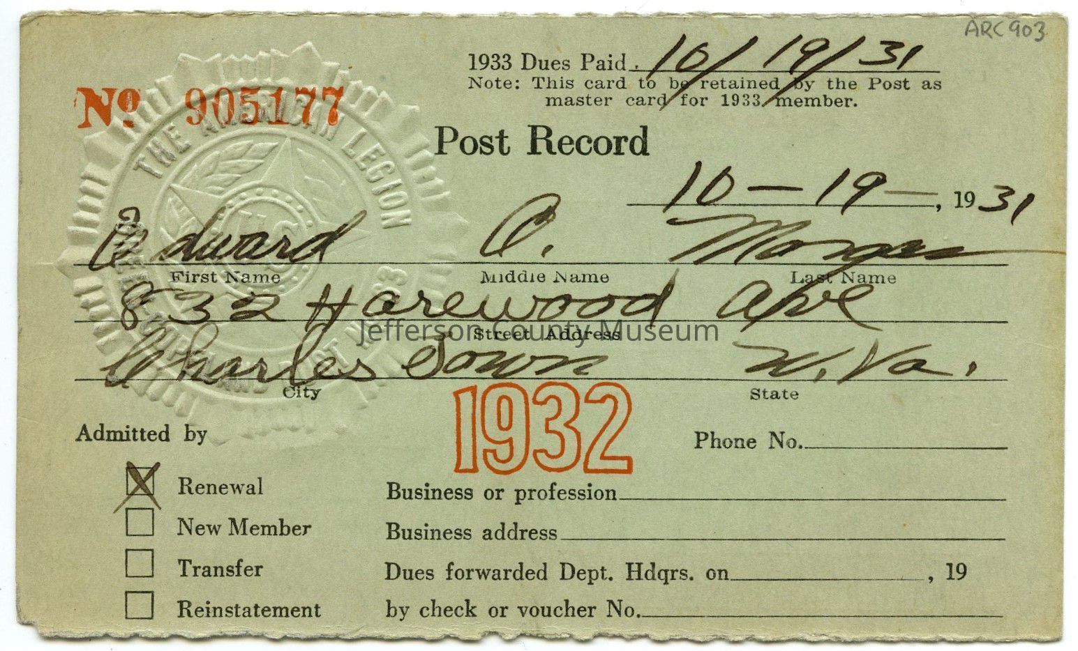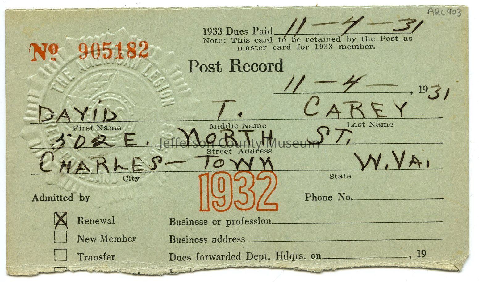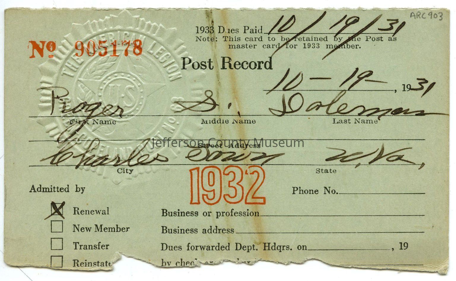 Twenty-nine post record membership cards for the African American American Legion Post in Charles Town: the Green- Copeland American Legion Post 63. The cards contain members' name, address, business or profession, business address, and dues paid. Each card has a box to check indicating if the member was admitted by renewal, new member, transfer, or reinstatement. In the top left corner printed in orange is a unique membership number. Dates for the cards range from 1930 to 1933.