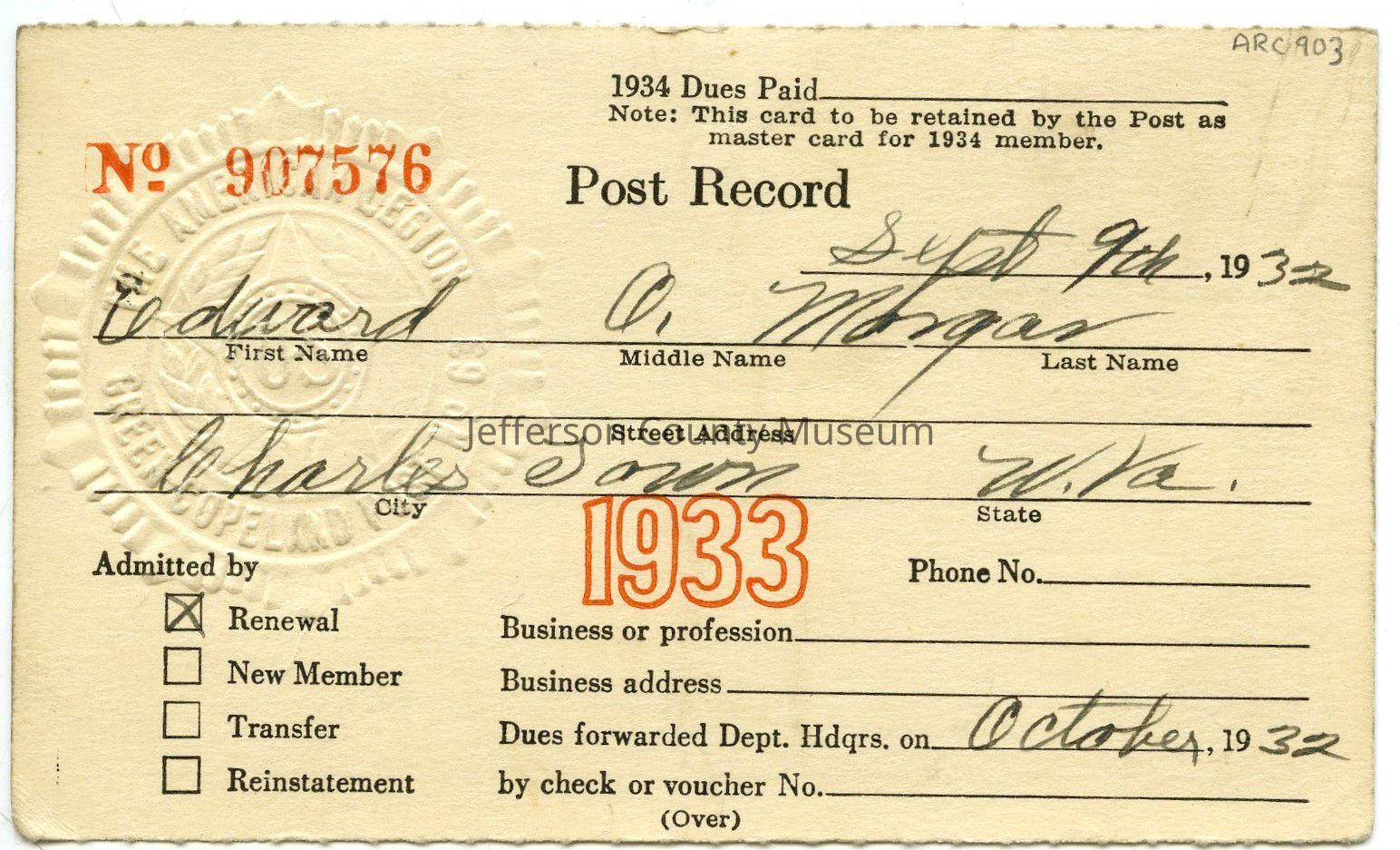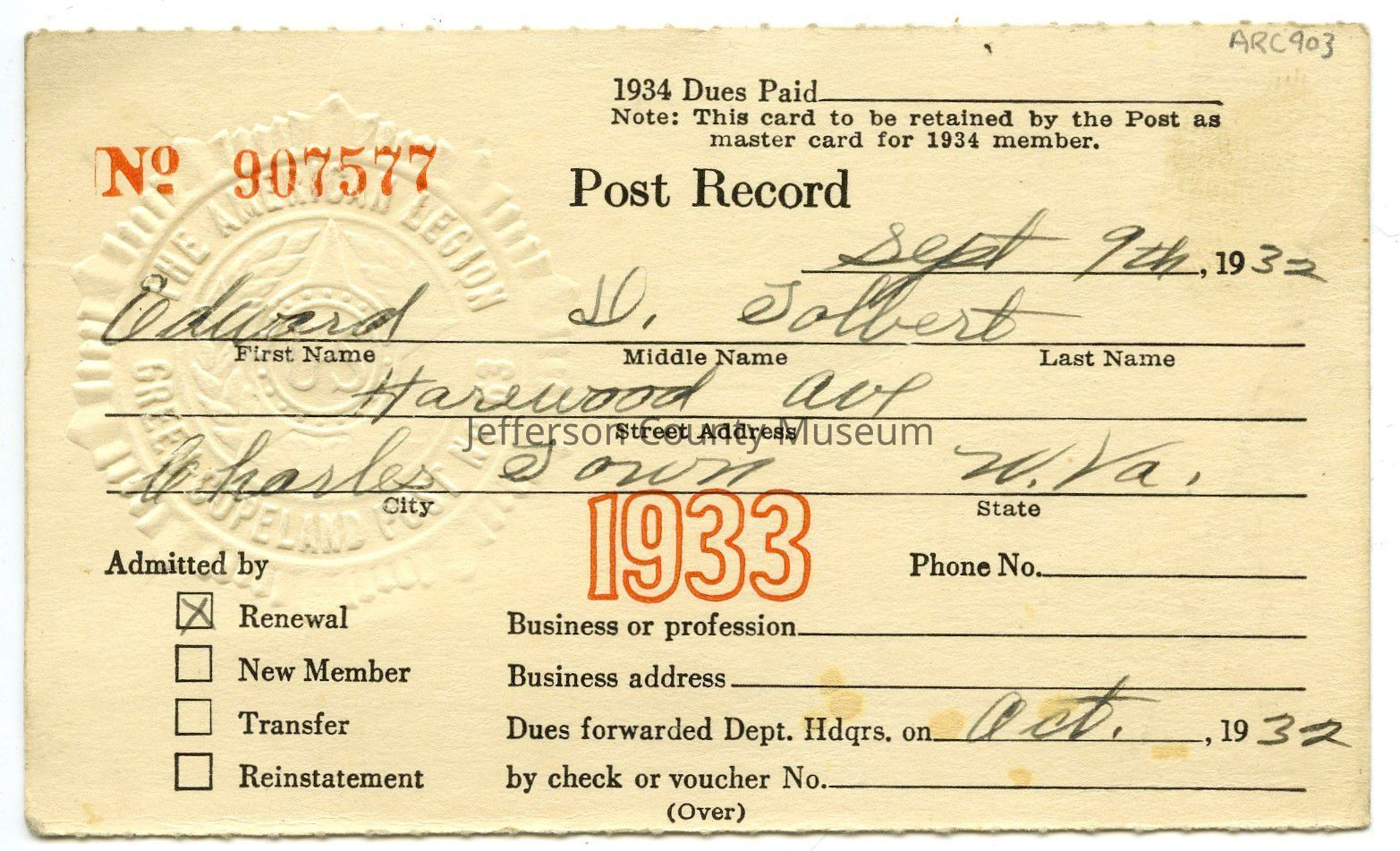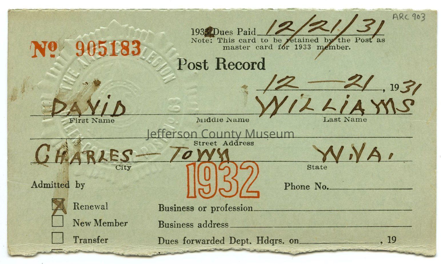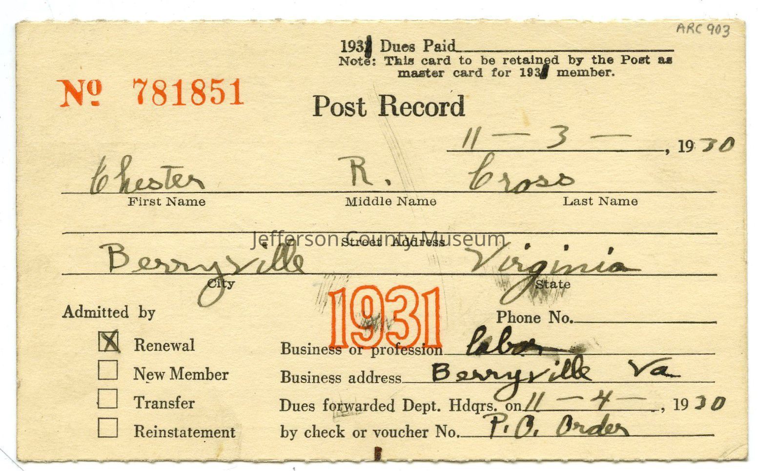 Twenty-nine post record membership cards for the African American American Legion Post in Charles Town: the Green- Copeland American Legion Post 63. The cards contain members' name, address, business or profession, business address, and dues paid. Each card has a box to check indicating if the member was admitted by renewal, new member, transfer, or reinstatement. In the top left corner printed in orange is a unique membership number. Dates for the cards range from 1930 to 1933.