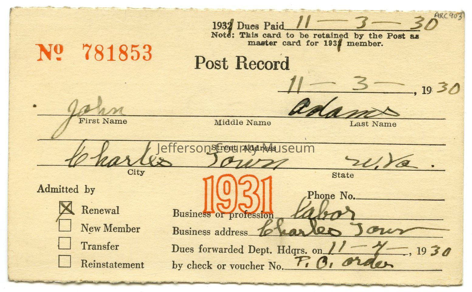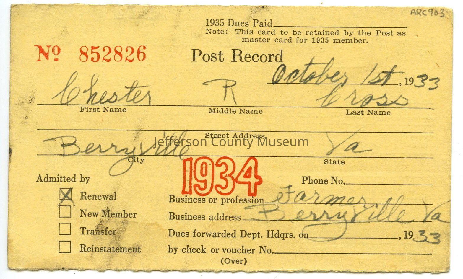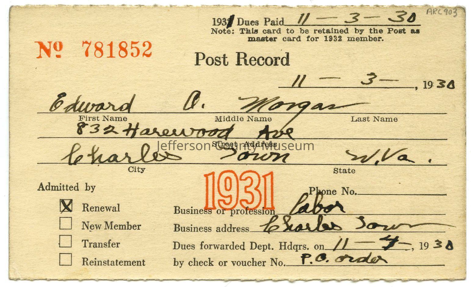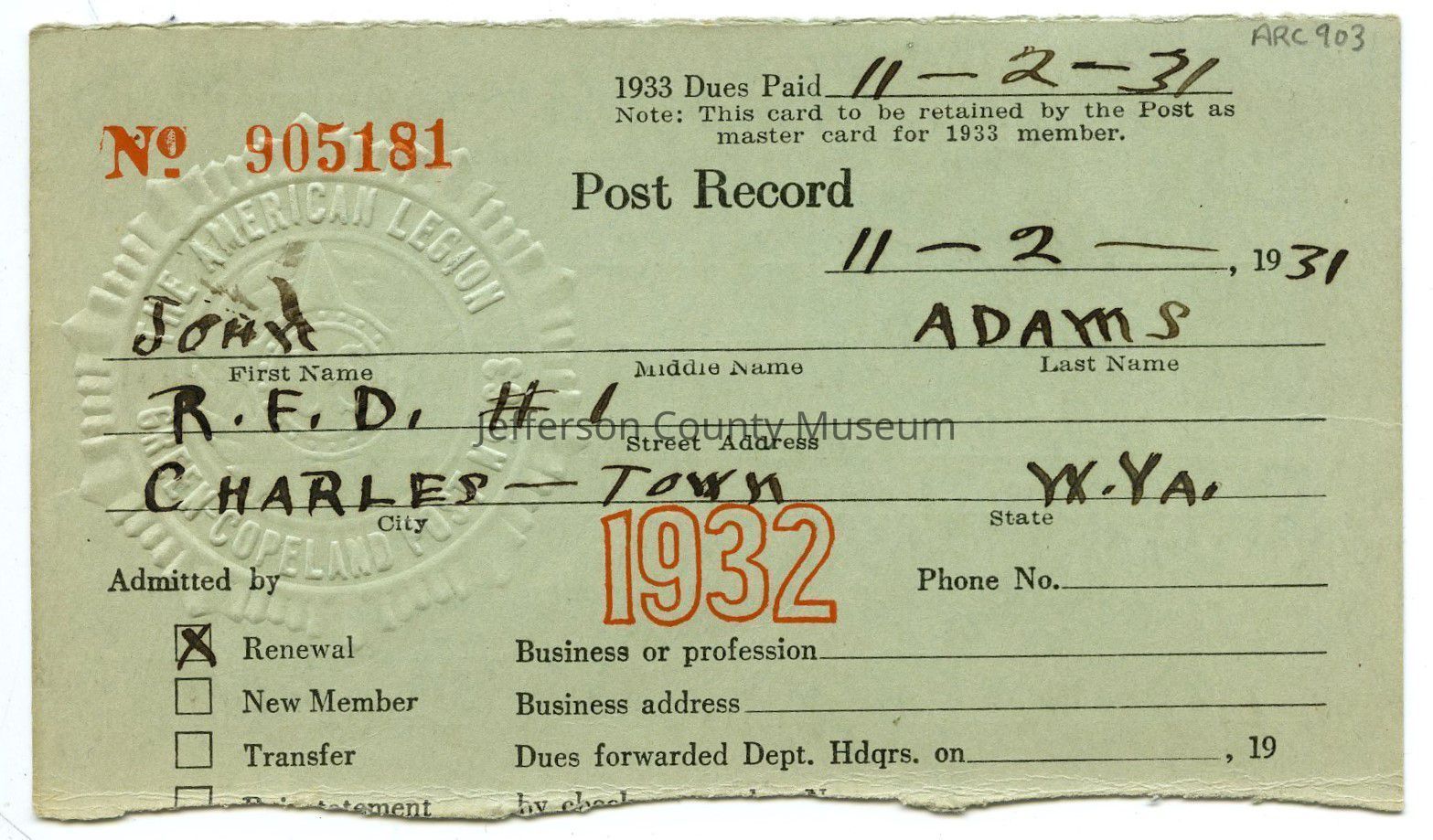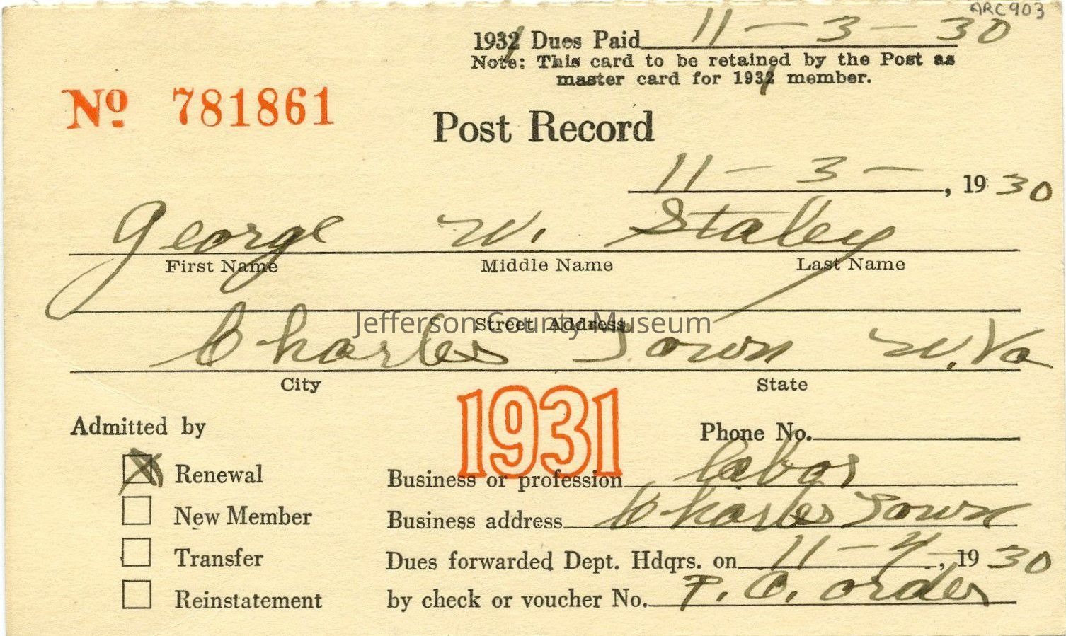 Twenty-nine post record membership cards for the African American American Legion Post in Charles Town: the Green- Copeland American Legion Post 63. The cards contain members' name, address, business or profession, business address, and dues paid. Each card has a box to check indicating if the member was admitted by renewal, new member, transfer, or reinstatement. In the top left corner printed in orange is a unique membership number. Dates for the cards range from 1930 to 1933.
