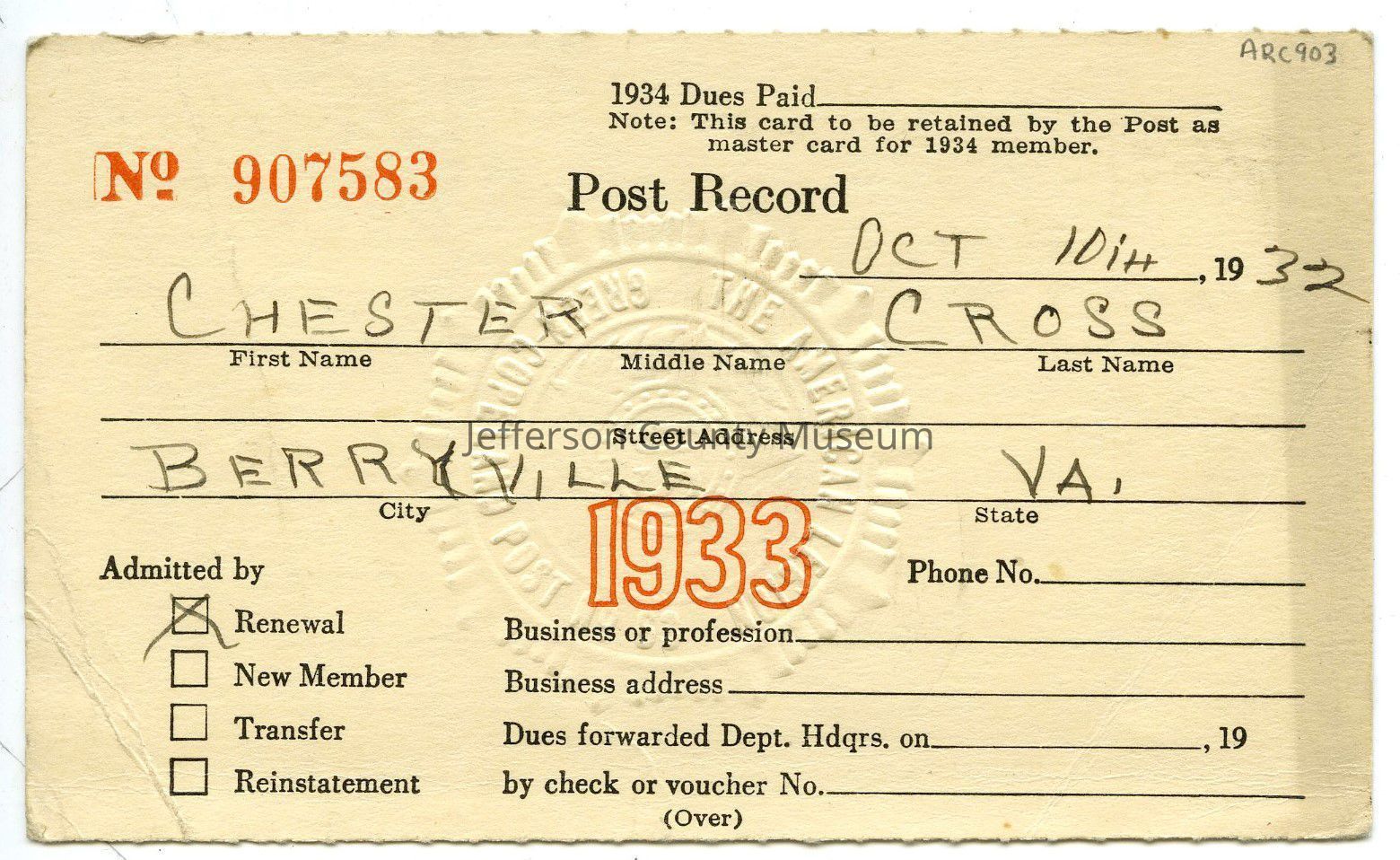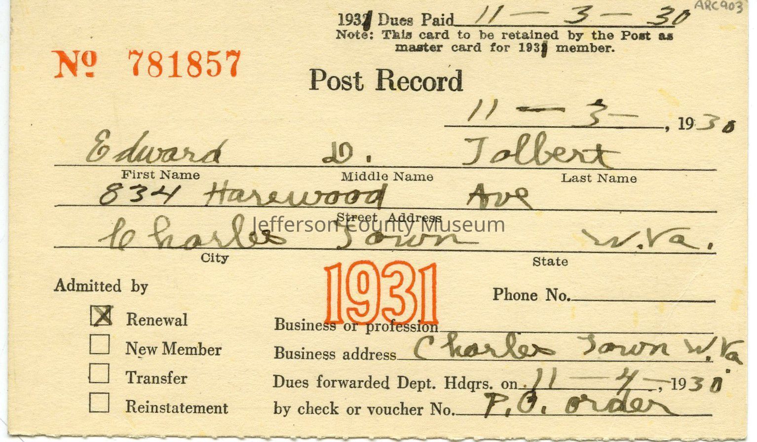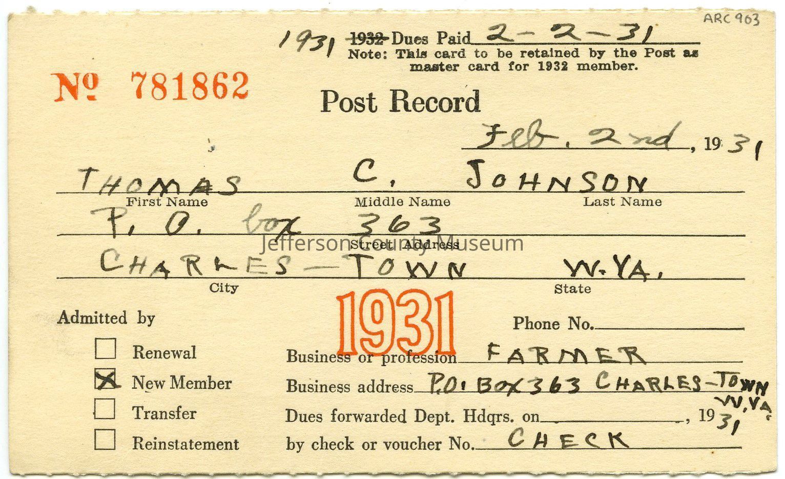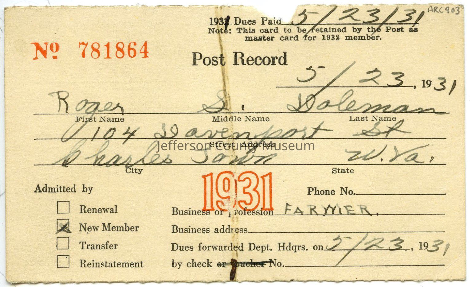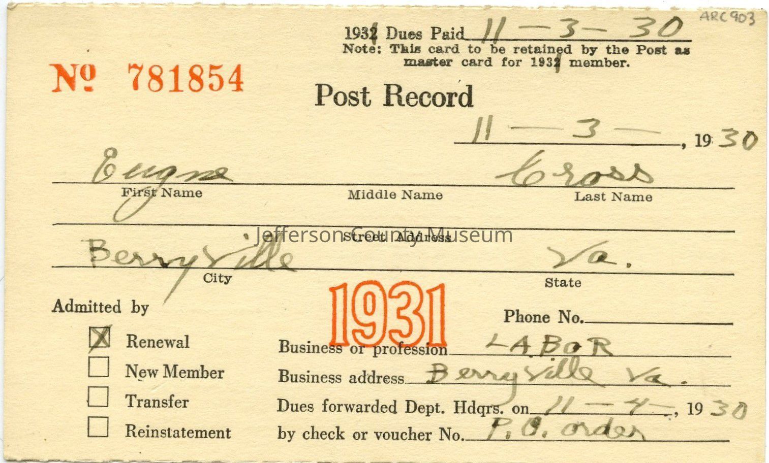 Twenty-nine post record membership cards for the African American American Legion Post in Charles Town: the Green- Copeland American Legion Post 63. The cards contain members' name, address, business or profession, business address, and dues paid. Each card has a box to check indicating if the member was admitted by renewal, new member, transfer, or reinstatement. In the top left corner printed in orange is a unique membership number. Dates for the cards range from 1930 to 1933.