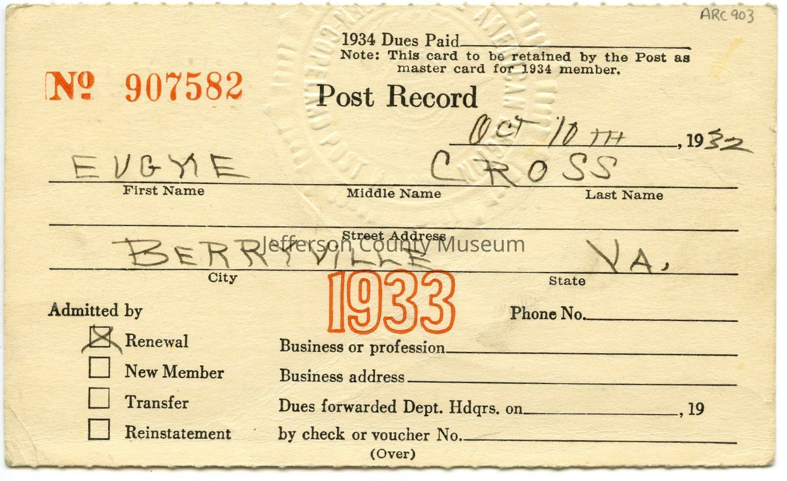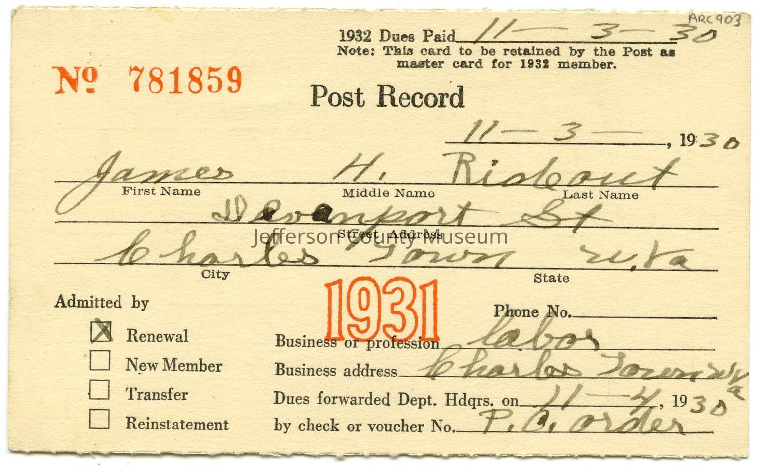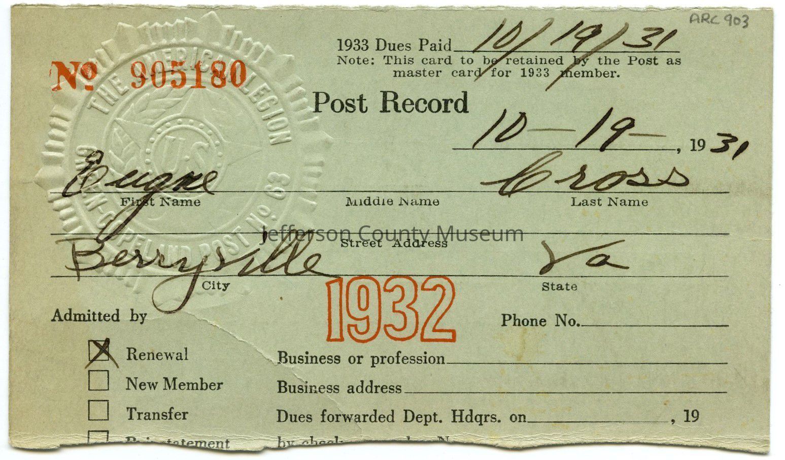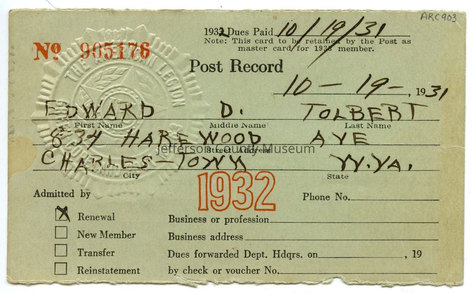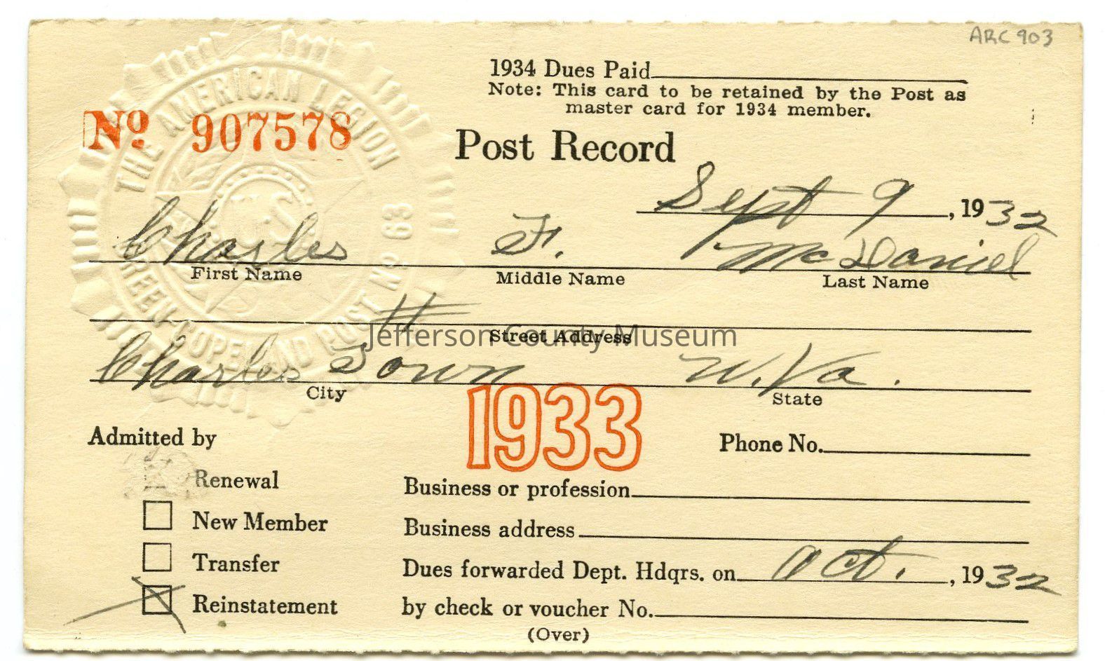 Twenty-nine post record membership cards for the African American American Legion Post in Charles Town: the Green- Copeland American Legion Post 63. The cards contain members' name, address, business or profession, business address, and dues paid. Each card has a box to check indicating if the member was admitted by renewal, new member, transfer, or reinstatement. In the top left corner printed in orange is a unique membership number. Dates for the cards range from 1930 to 1933.