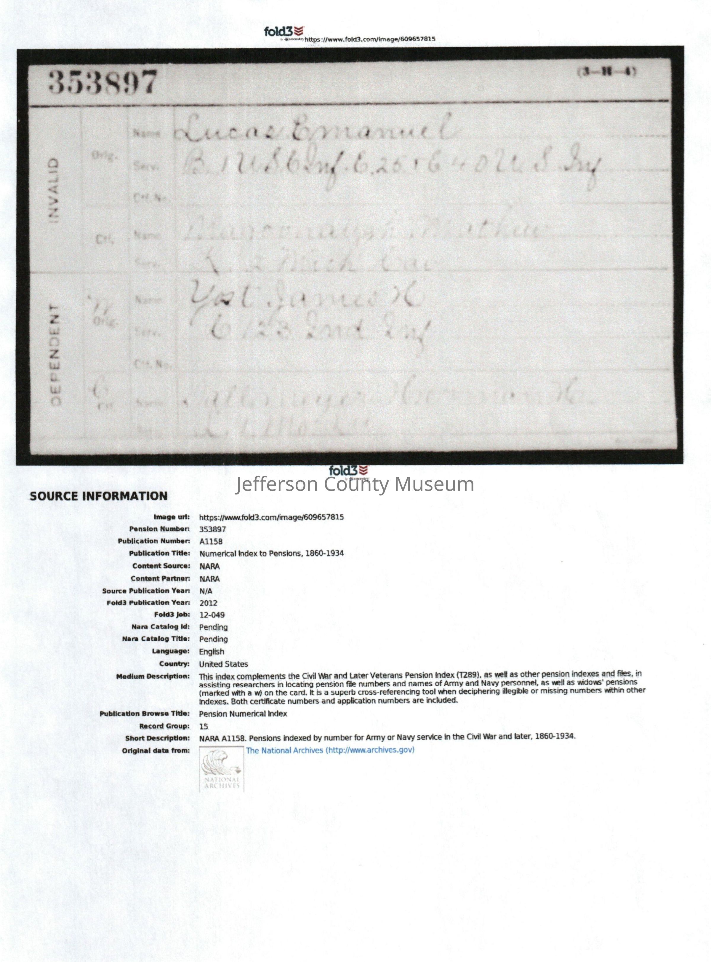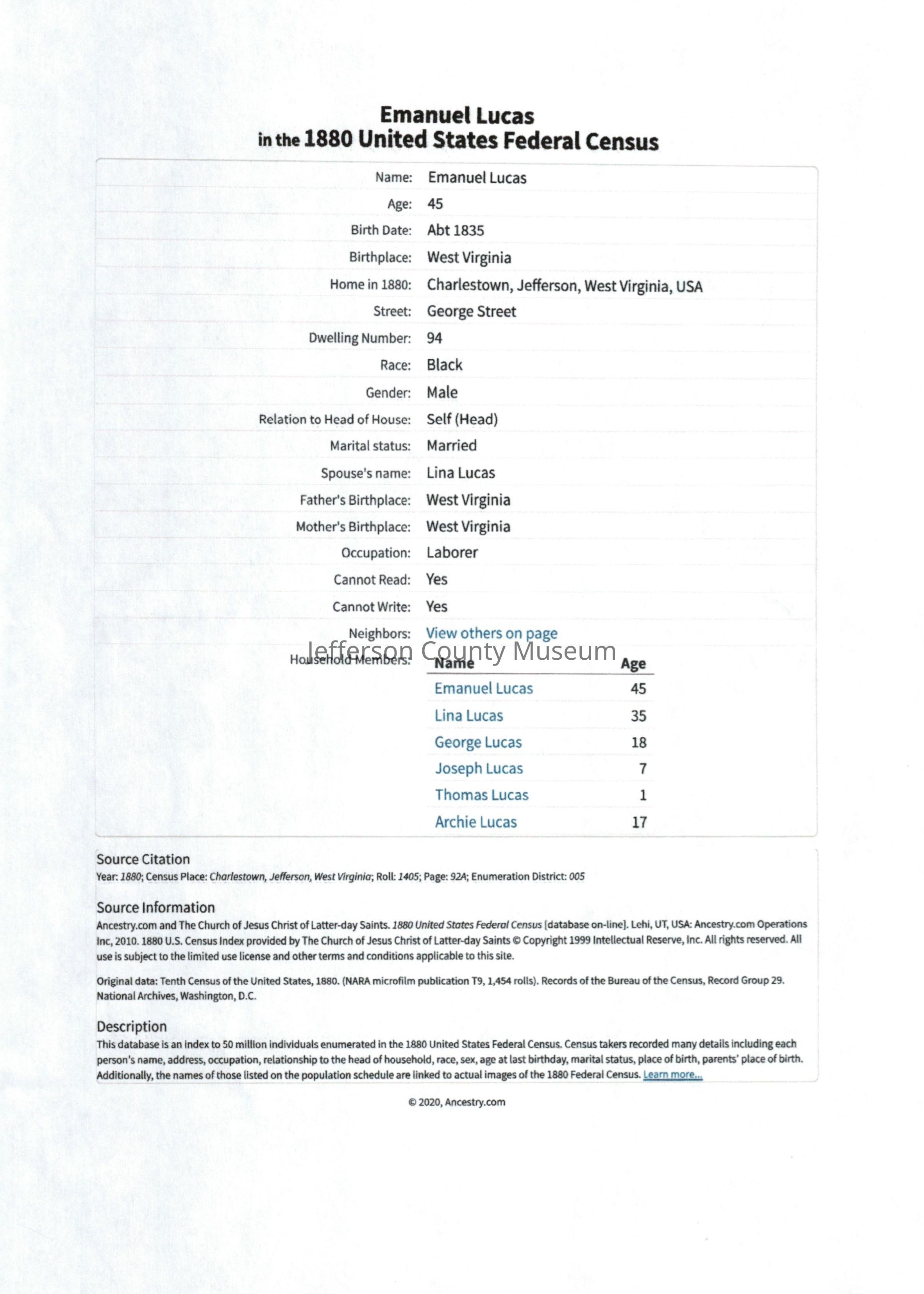 Lucas, an African American, served in Company B, 1st Regiment, D. C. Colored Volunteers. According to the 1880 U. S. Census, he was born about 1835 and lived at the time of the census on George Street in Charles Town with his family.