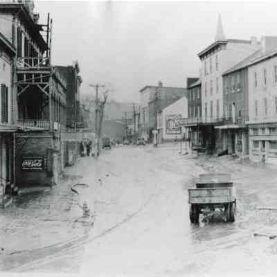 Flood of March 18, 1936 at Harpers Ferry. View looking west up Shenandoah Street. Potomac Street on right. Harpers Ferry Post Office and Hotel Conner on left. Dittmeyer's pharmacy on right. Photo shows aftermath once floodwaters have receded.Acquisition