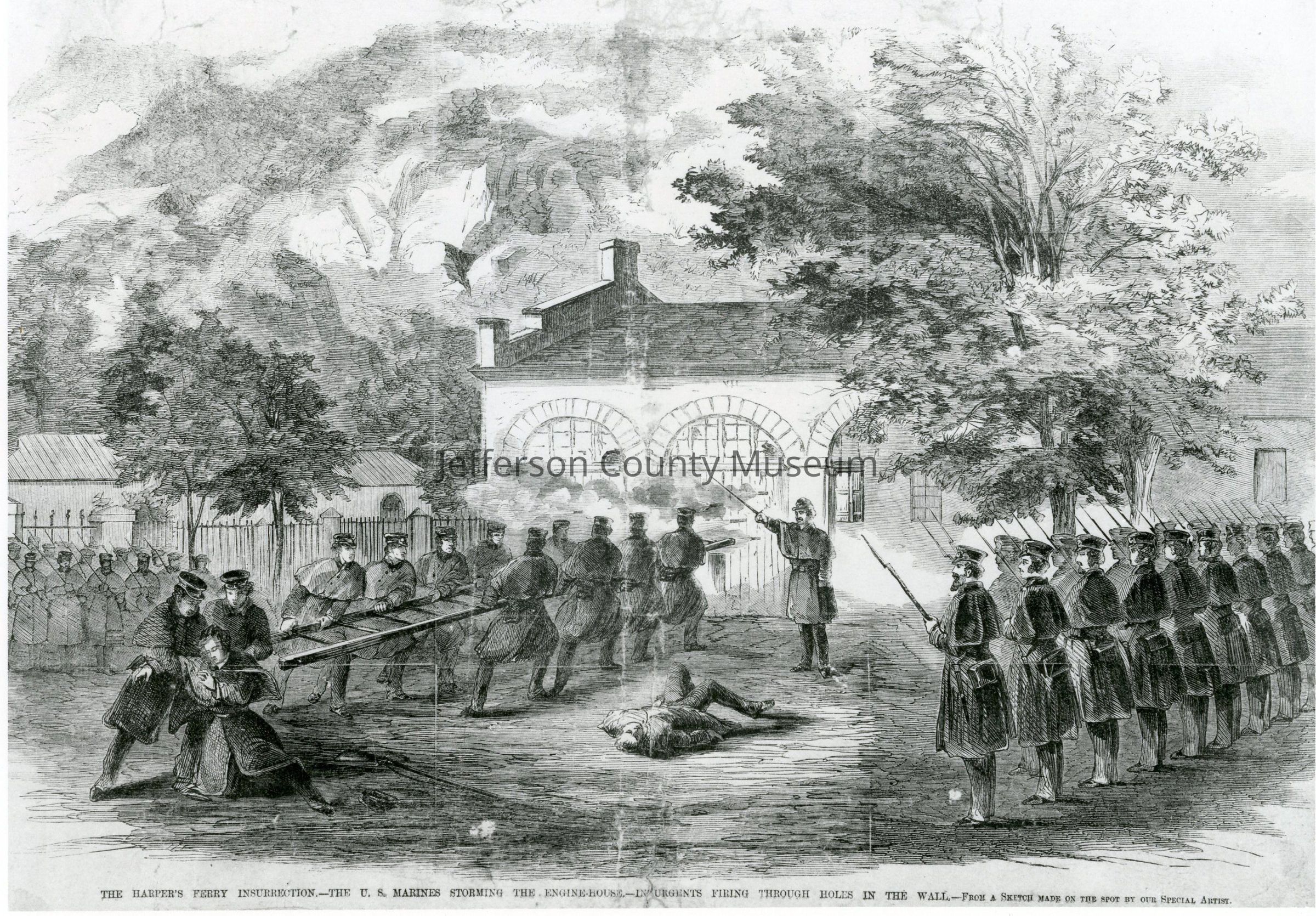 Drawing of marines storming the engine house during John Brown's raid on the U. S. Armory at Harper's Ferry, Virginia Includes two copies