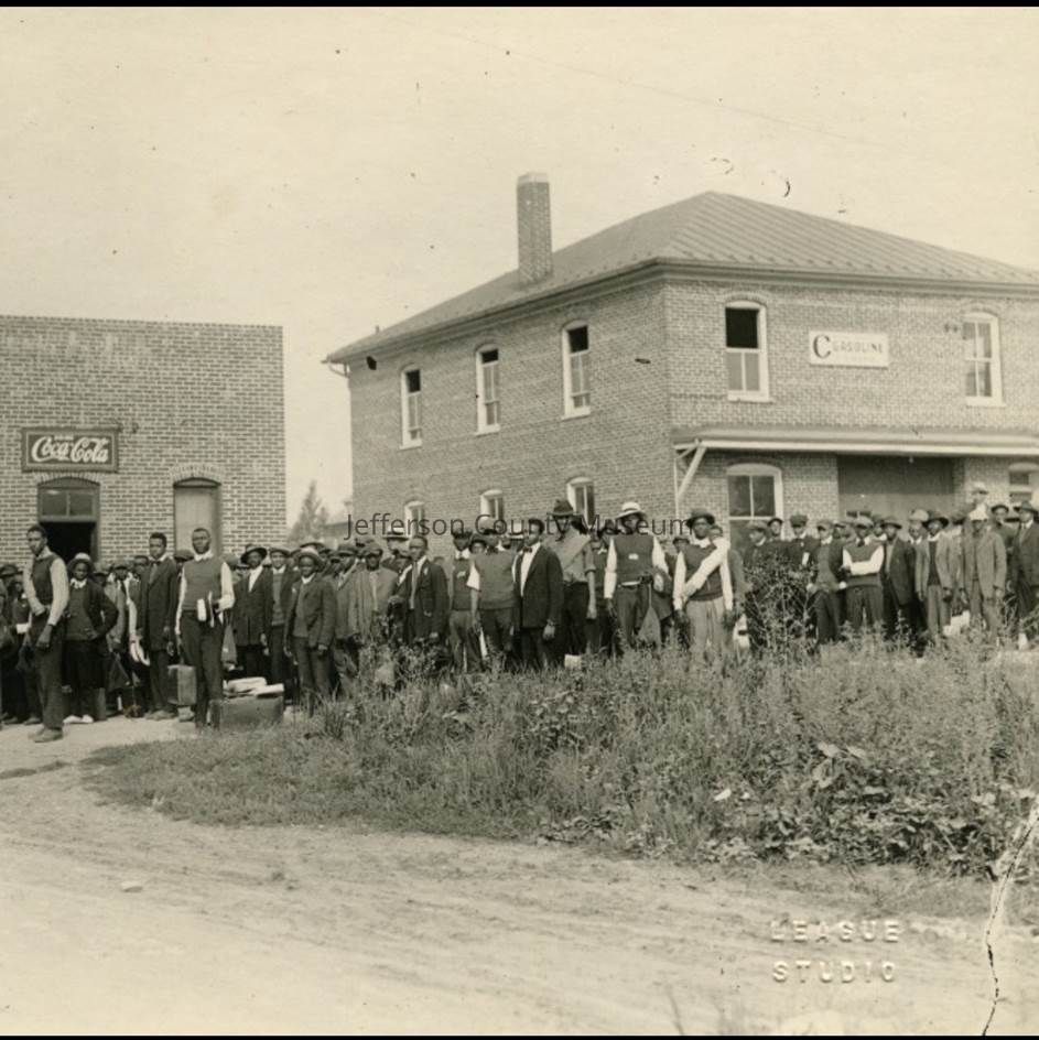 World War I African American inductees on North Mildred Street awaiting a train to Baltimore. The building to the right is 312-314 North Mildred Street and the building on the left was Davey's Happy Land Inn and Cab Stand. The B&O Railroad Station is unseen to the left of the photo.