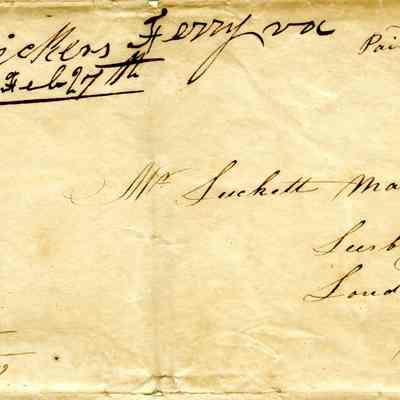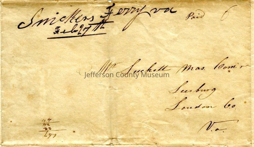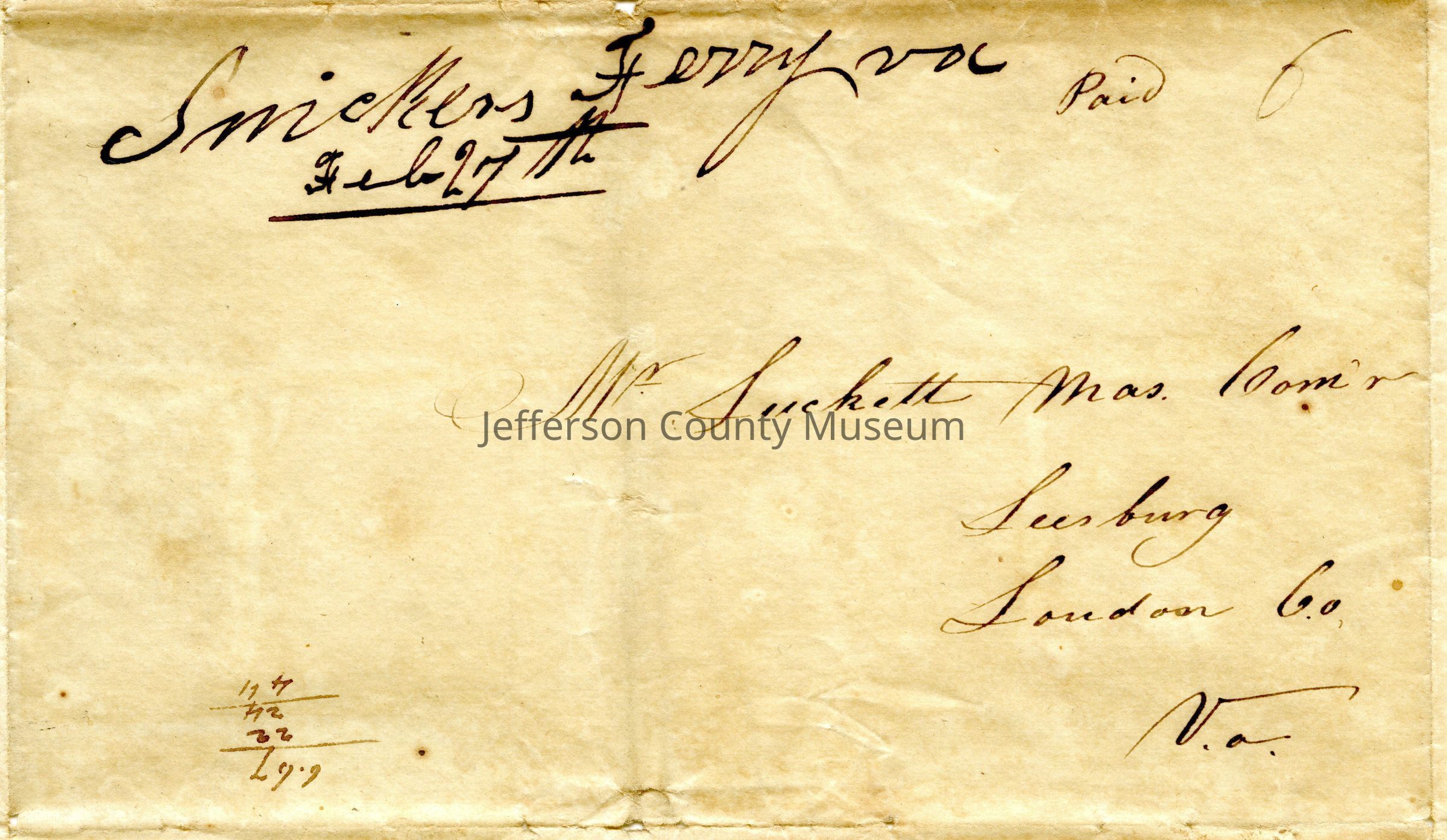 Upper: An 1839 Letter mailed to Mr. Luckett in Leesburg, Virginia, from Snickers Ferry, Virginia. The six-cent postage is handwritten in the upper right hand corner. (ARC150-CHL-C1 014)