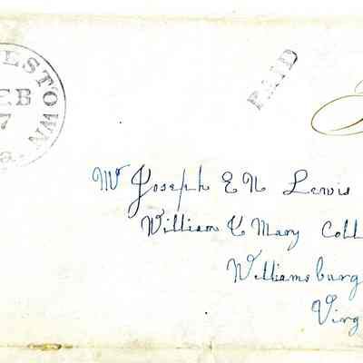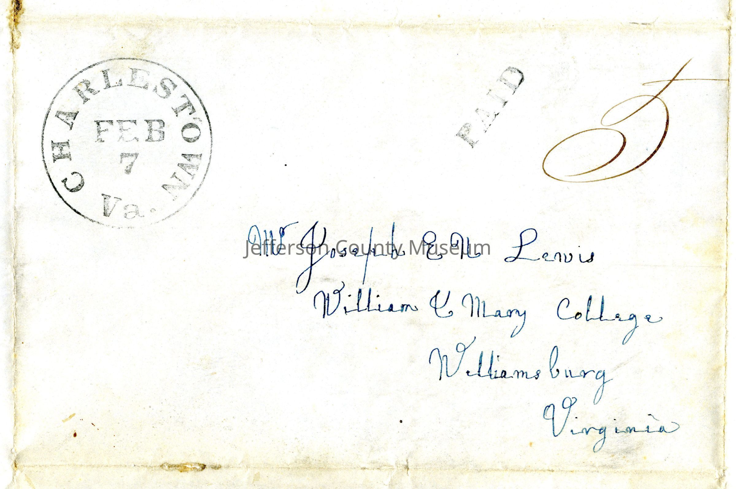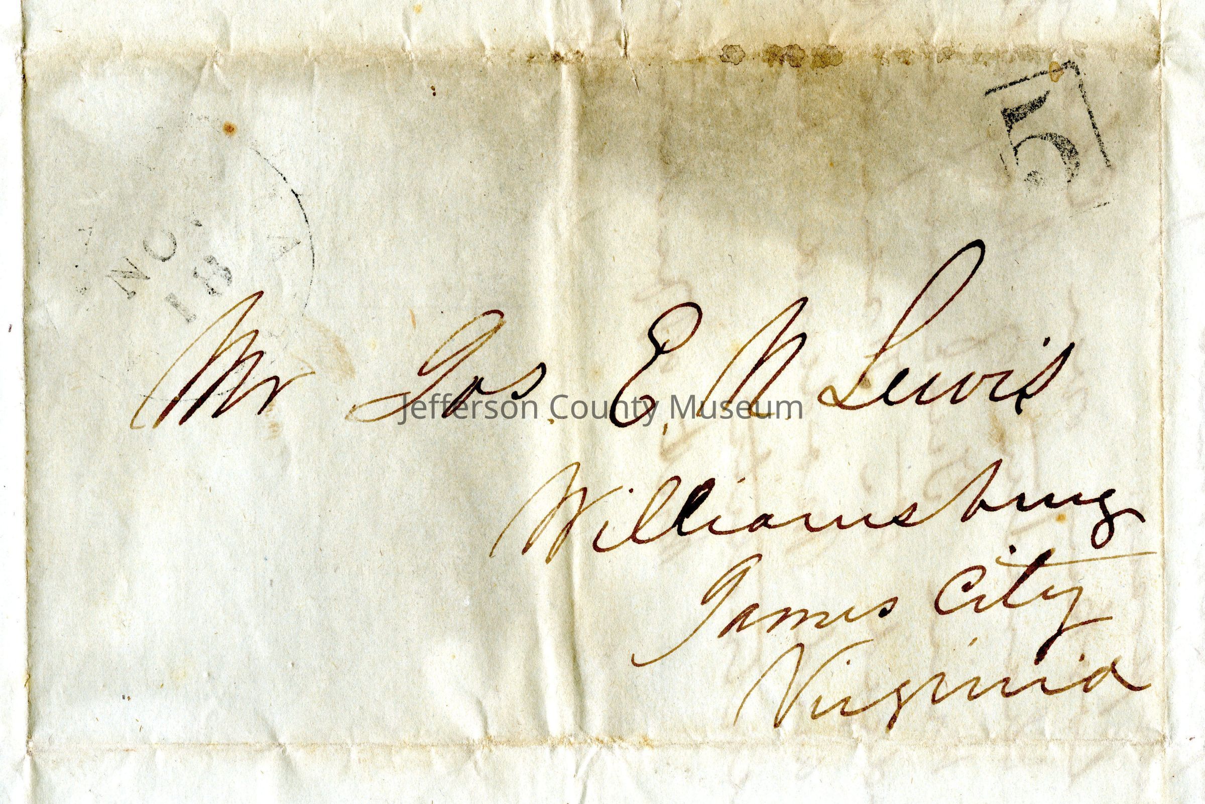 Middle right: An 1848 letter written to Joseph E. N. Lewis in Williamsburg, Virginia, from his mother, Mary Muse Lewis in Charlestown, Virginia [now Charles Town, West Virginia]. The five-cent postage is handwritten in the upper right hand corner. (ARC150-JNL-C 011)