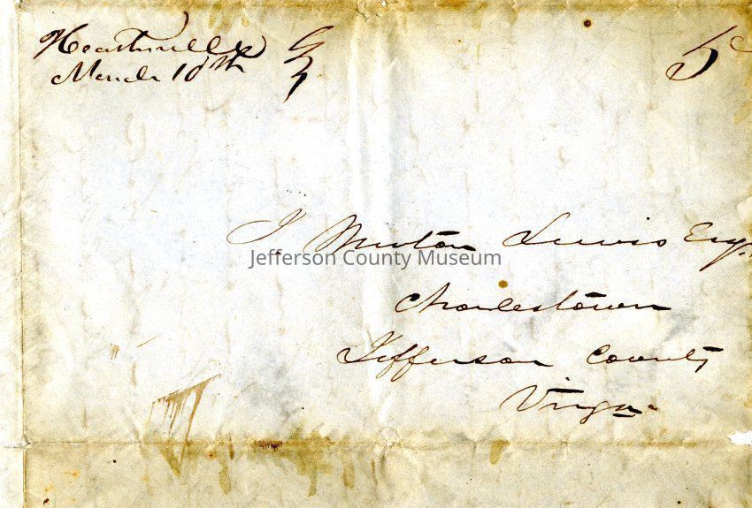 Lower: An 1849 letter written to Joseph E. N. Lewis in Charlestown, Virginia [now Charles Town, West Virginia], from Robert Lackey in Heathsville, Virginia. The five-cent postage is handwritten in the upper right hand corner. (ARC150-JNL-C-8 013)