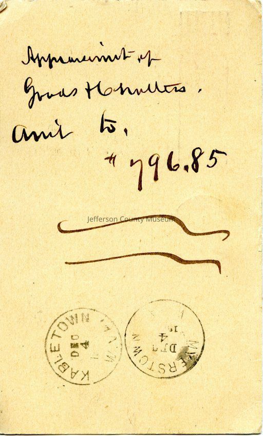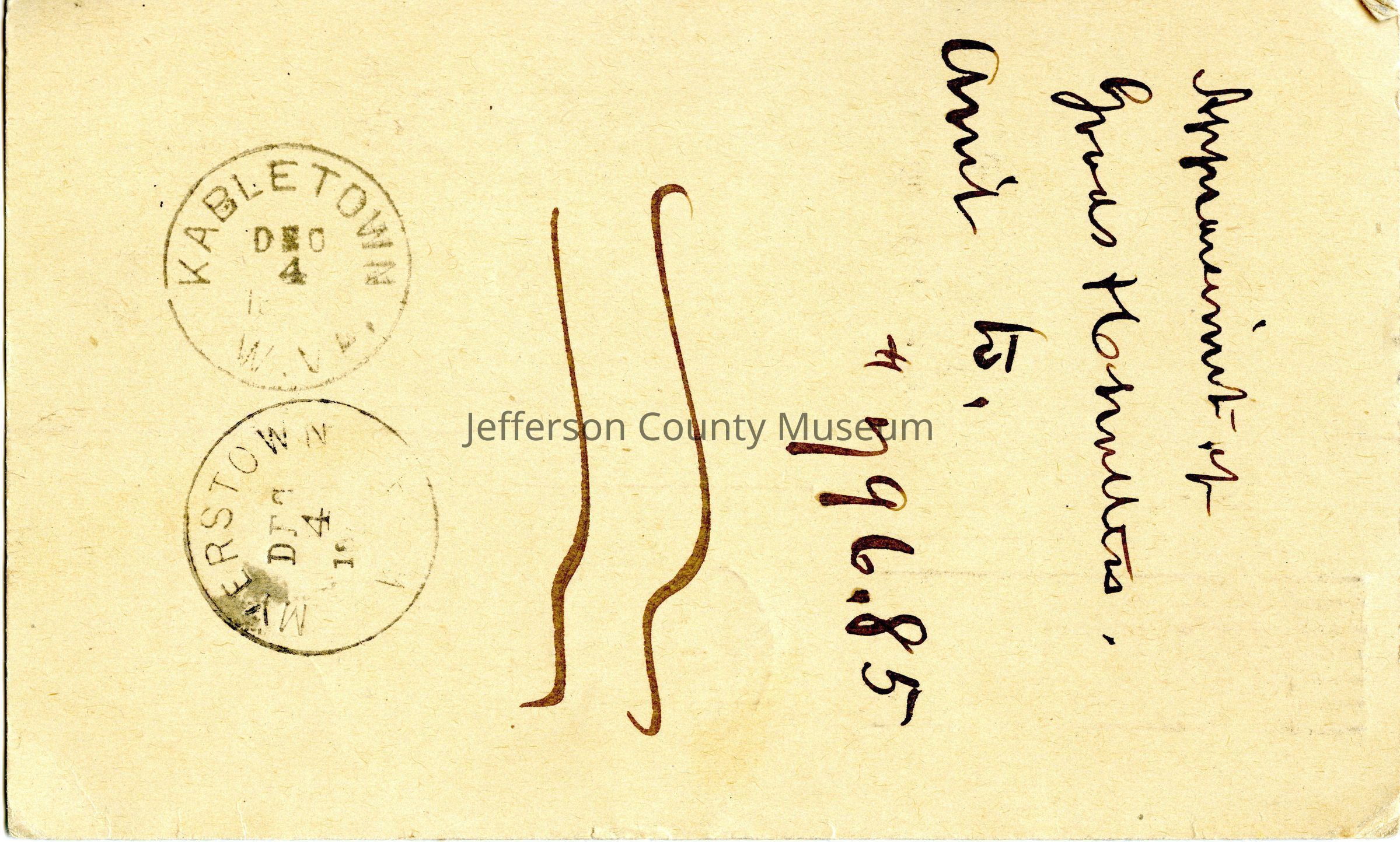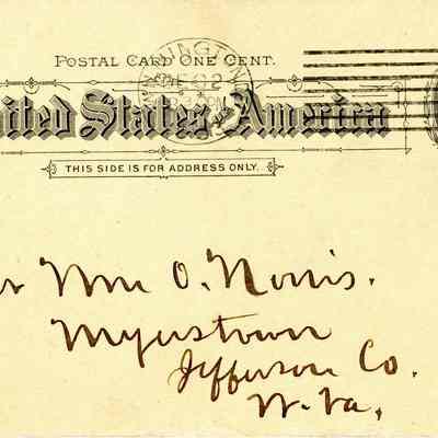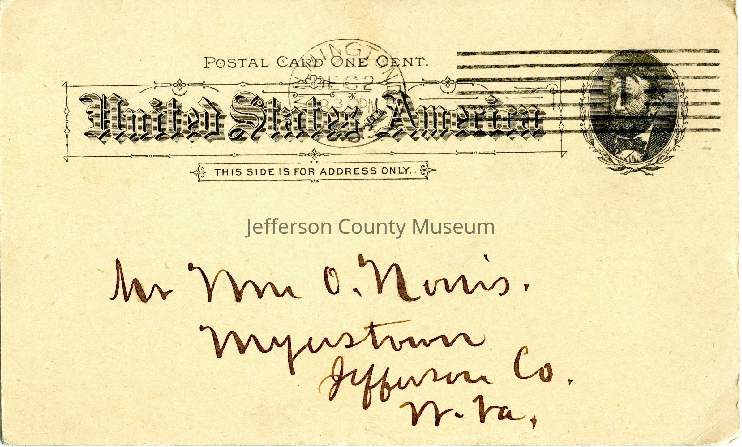 One-cent United States of America Grant postcard addressed to Mr. William O. Norris in Myerstown, West Virginia. Postmarked in Washington, D.C., in 1880s or 1890s (date partly illegible); cancelled on back in both Kabletown and Myerstown.Acquisition
