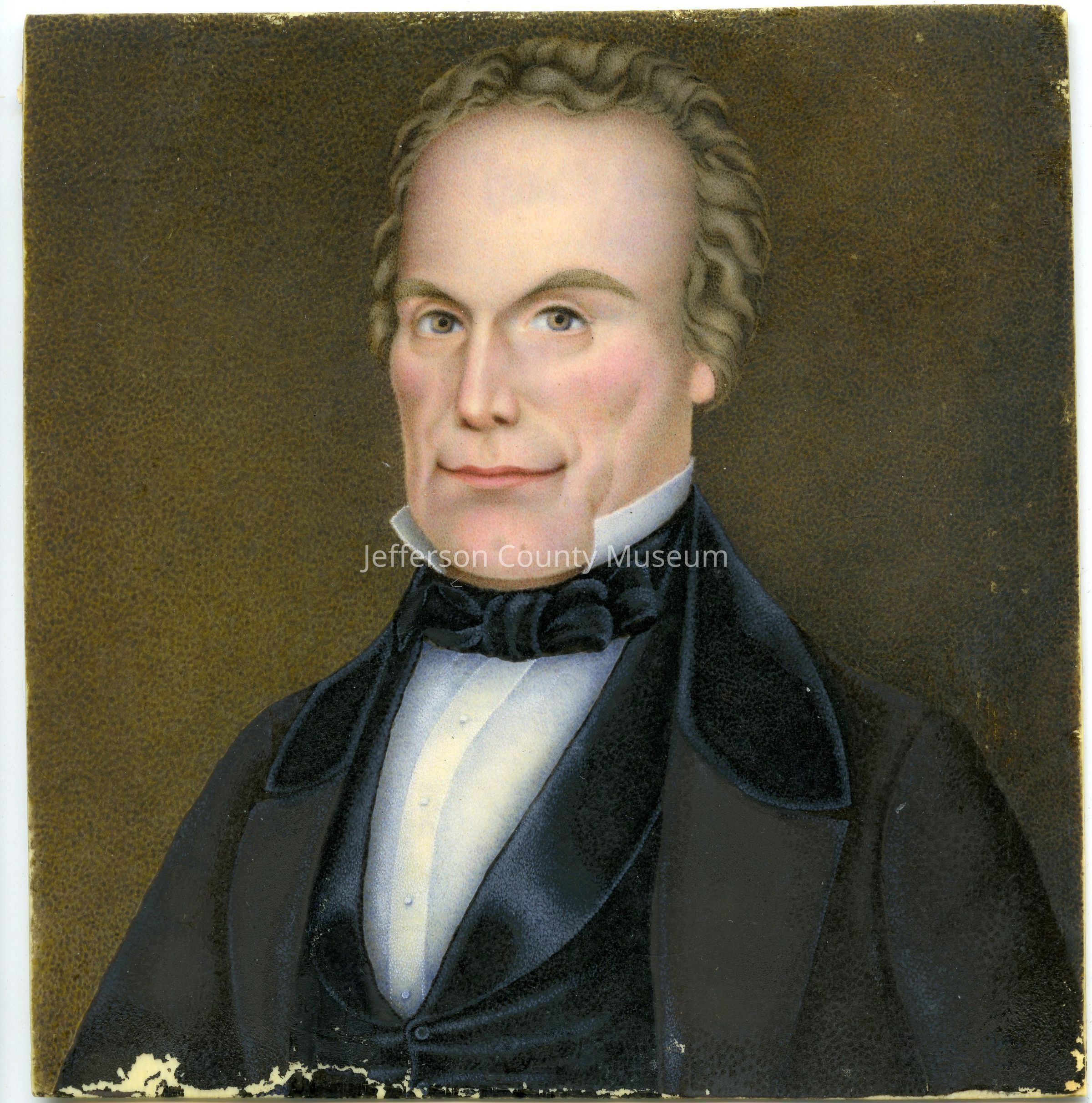 IMG3949-1: Miniature painting. Written in pencil on bottom left on back of painting is: "An ideal likeness of Henry Clay painted by Adeline Osburn Dec 1859." Written in red marking pen (incorrectly): "Logan Osburn Col. L.O. Shutt's great grandfather."