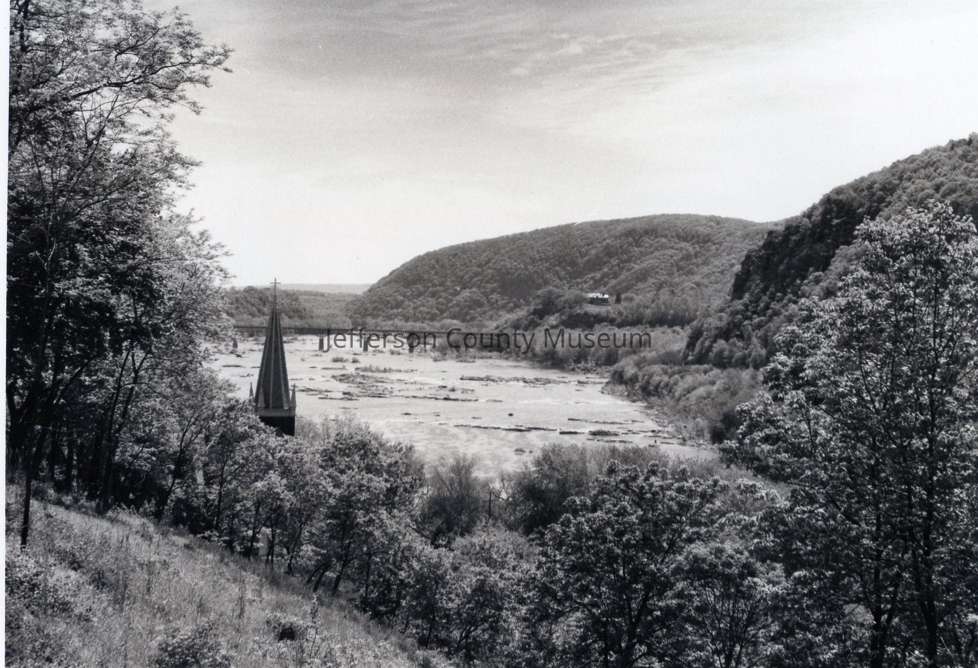 View of the Gap at Harpers Ferry. Steeple of St. Peter's Catholic Church in foreground. White Horse Rapids and the Route 340 bridge in background.
