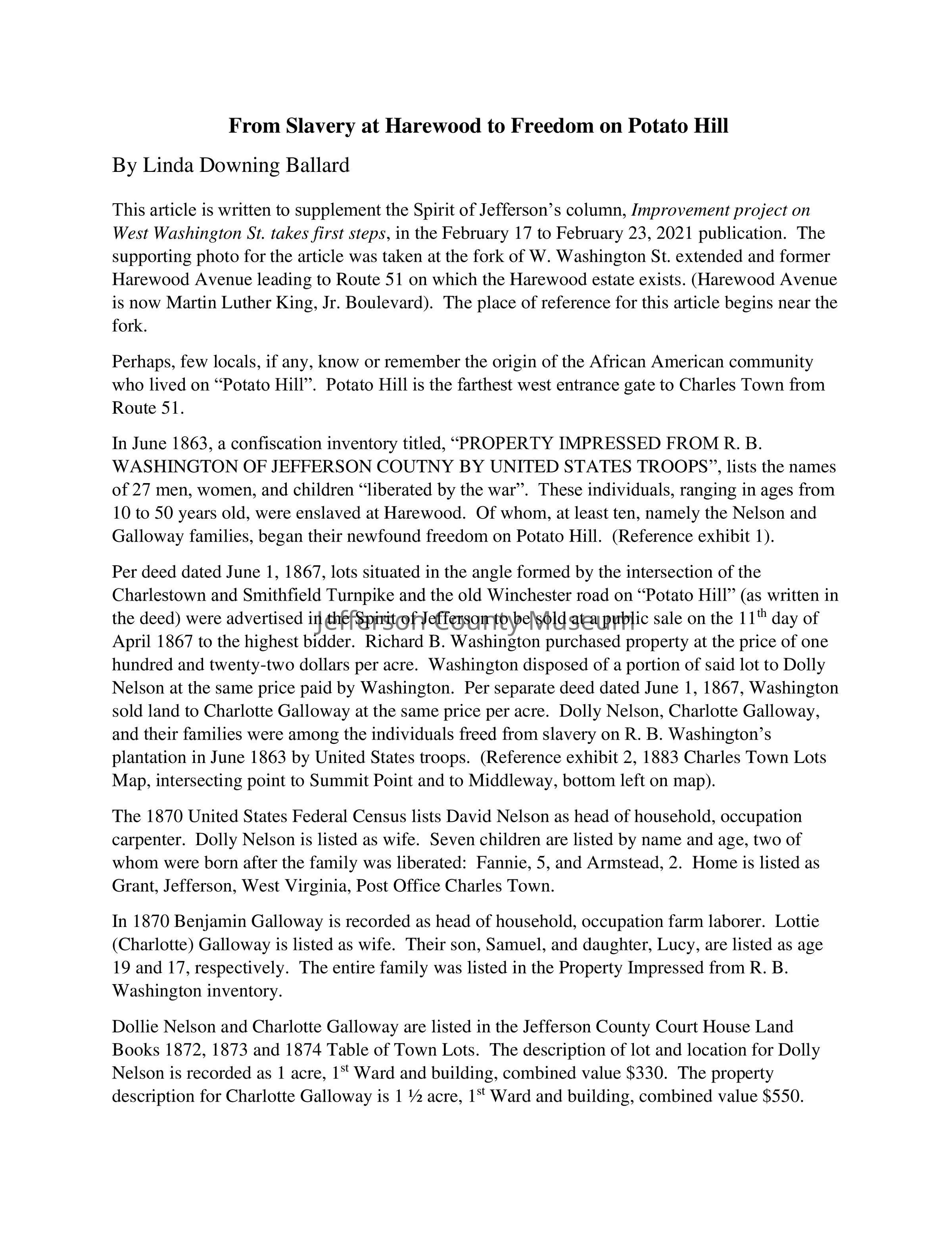 Digital copy of article, "From Slavery at Harewood to Freedom on Potato Hill," by Linda Downing Ballard. Completed March 22, 2021. Provides history of the first African Americans to settle on Potato Hill in Charles Town.