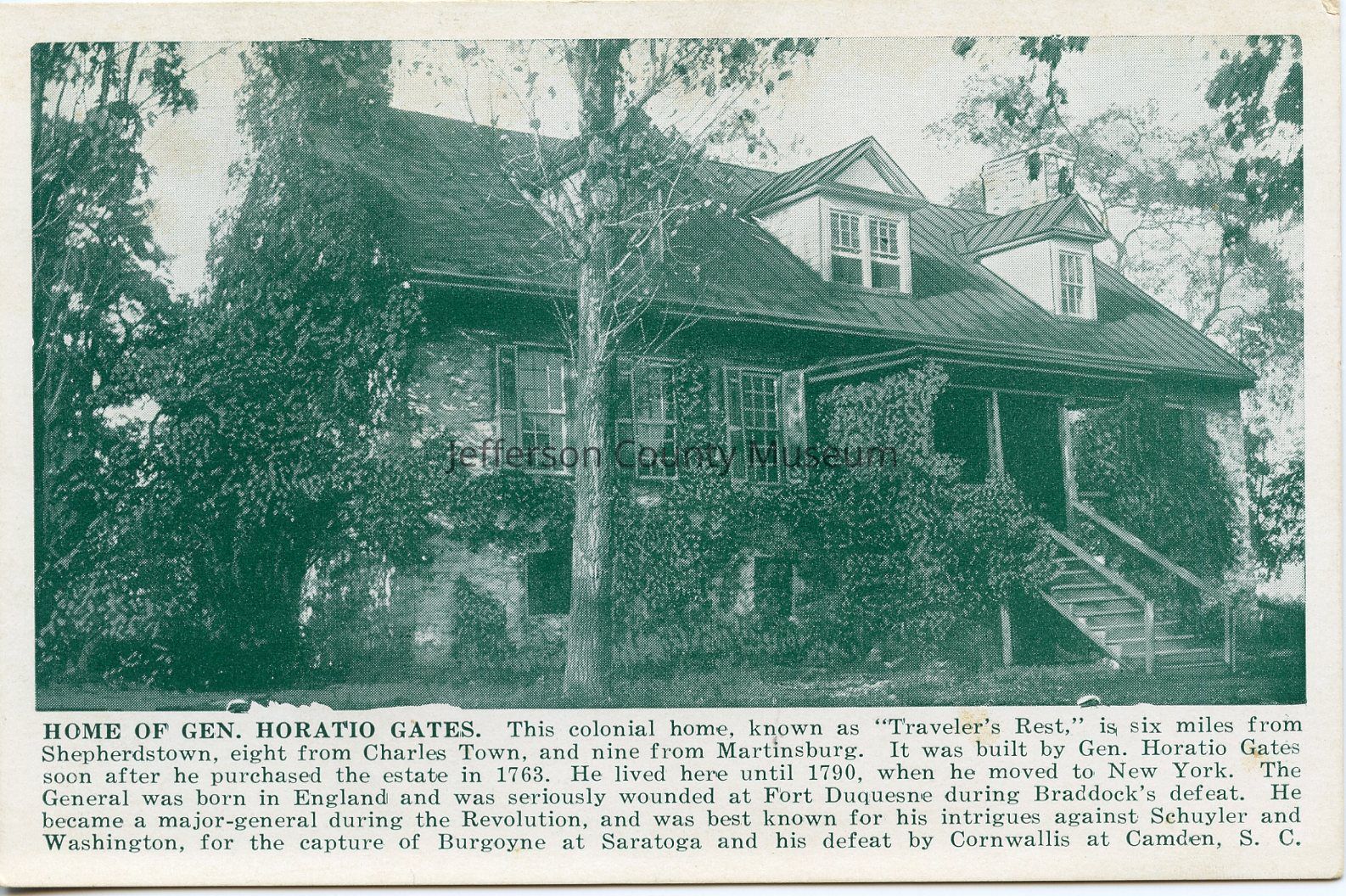 Home of General Horatio Gates. This colonial home, known as Traveler's Rest, is six miles from Shepherdstown, eight from Charles Town, and nine from Martinsburg. It was built by General Horatio Gates soon after he purchased the estate in 1763. He lived there until 1790, when he moved to New York. The general was born in England and was seriously wounded at Fort Duquesne during Braddock's defeat. He became a major-general during the Revolution and was best known for his intrigues against Schuyler and Washington, for the capture of Burguyne at Saratoga, and his defeat by Cornwallis at Camden, SC.Acquisition