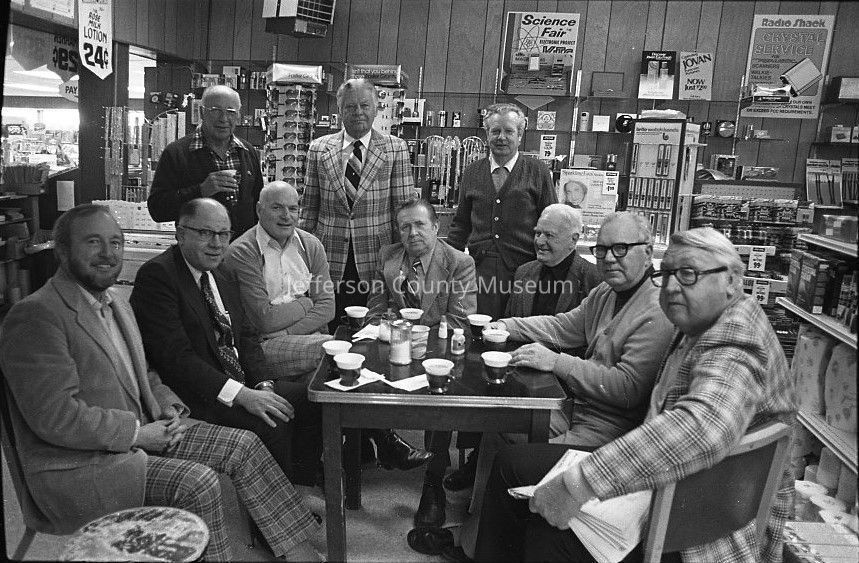 IMG3964007 Stuck & Alger Pharmacy coffee klatch - 13 negatives and 1 contact sheet. Front row from left to right: unidentified, Joseph Christian, Donald Master, Henry Morrow, 2 unidentified men, J. B. "Blackie" Davis; back row: unidentified man, Dr. James Moler, Tom Steptoe.