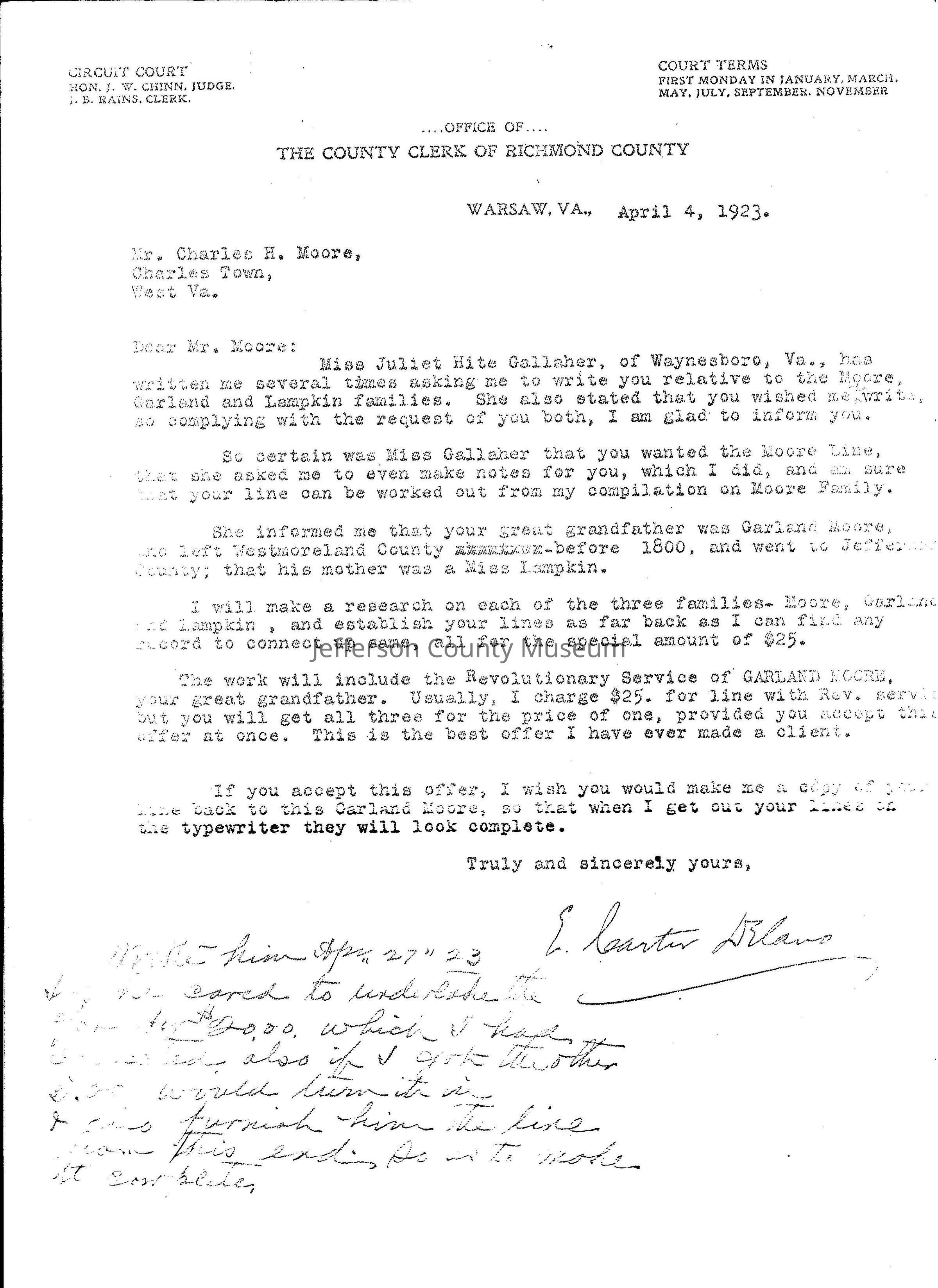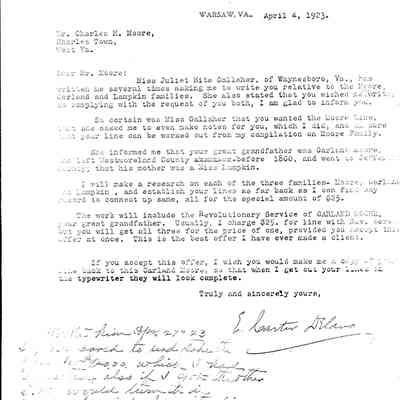 Letter from County Clerk of Richmond City to Charles H. Moore regarding the Moore, Garland, and Lampkin families, dated April 4, 1923; photograph of (Tee) Matilda Wickham Berry Moore in 1909; and Berry lineage introduction written by Bonnie Moore.)