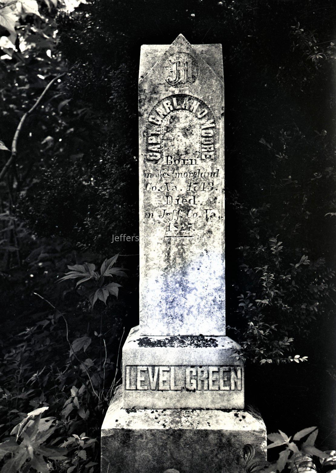 ARC969-6: Captain Garland Moore (1743-1827) headstone. "Level Green" engraved at bottom of headstone. (Level Green was a farm house built by Garland Moore (1790-1795) on what is known as Wiltshire Road in Kearneysville.)