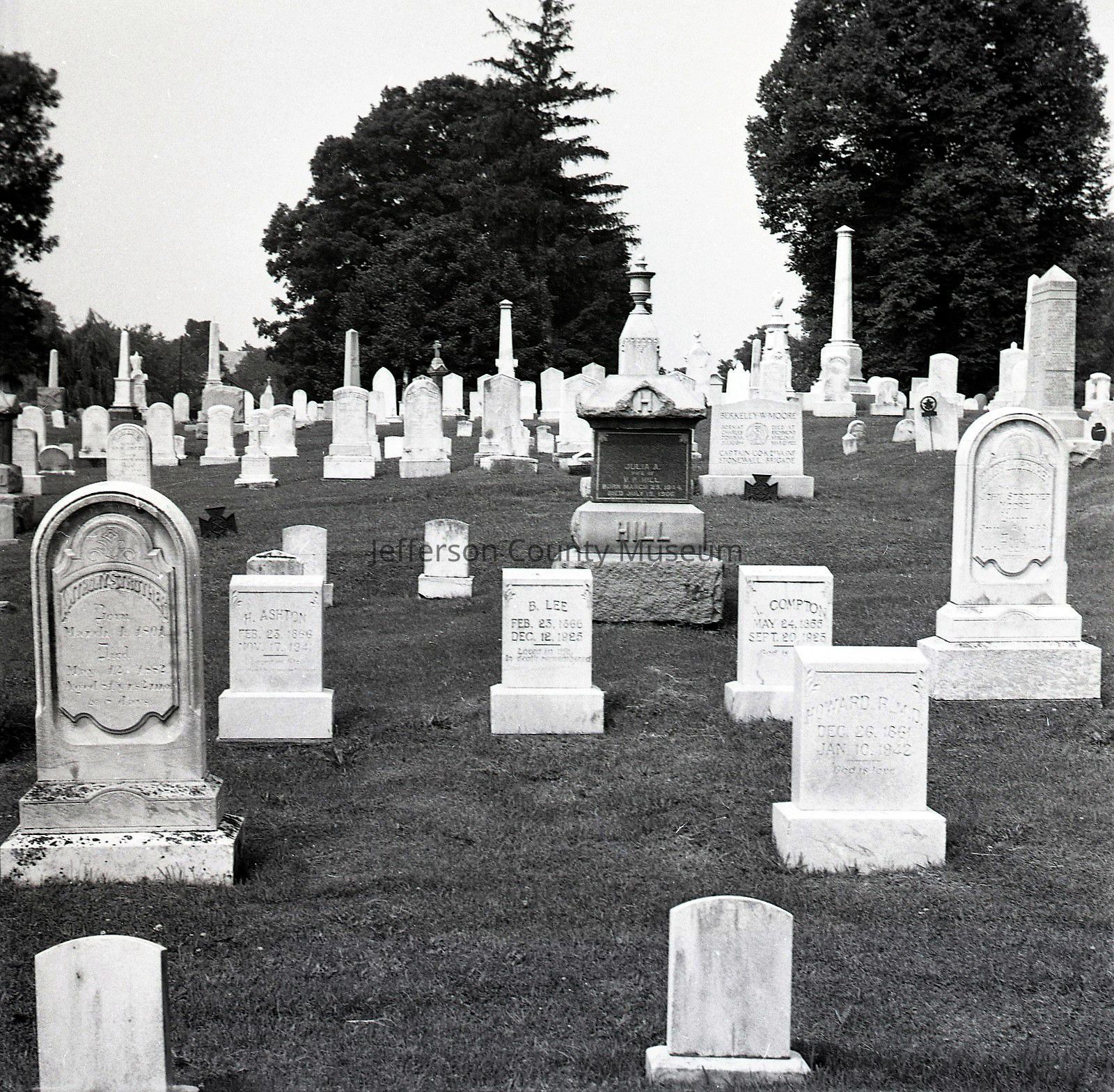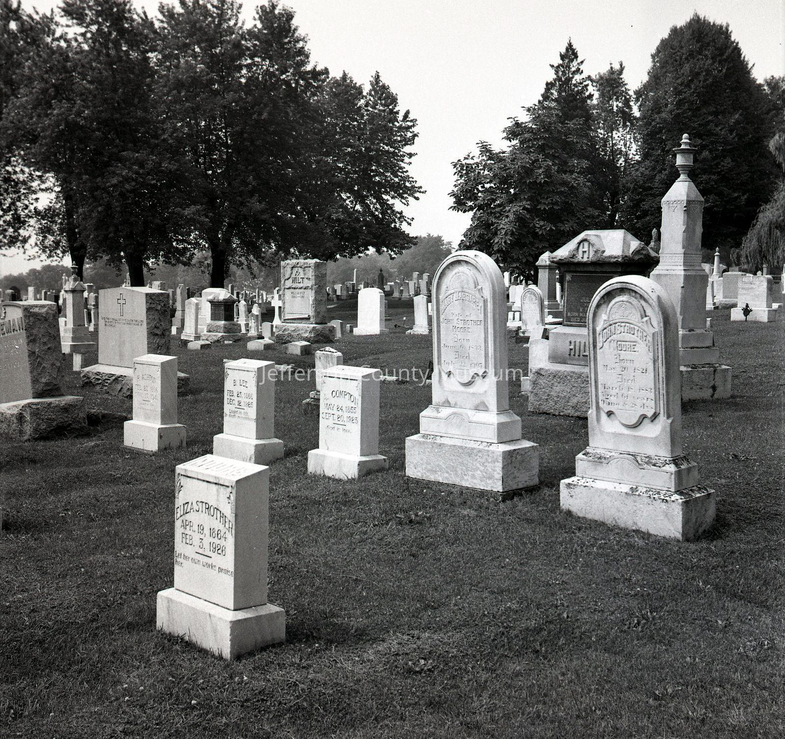 ARC969-14: Herbert Ashton (1866-1941); B. Lee (1866-1925); A. Compton (1855-1923); Mary Margaret Moore (1833-1905), wife of John Strother Moore; John Strother Moore (1821-1883); and Eliza Strother (1864-1926) headstones