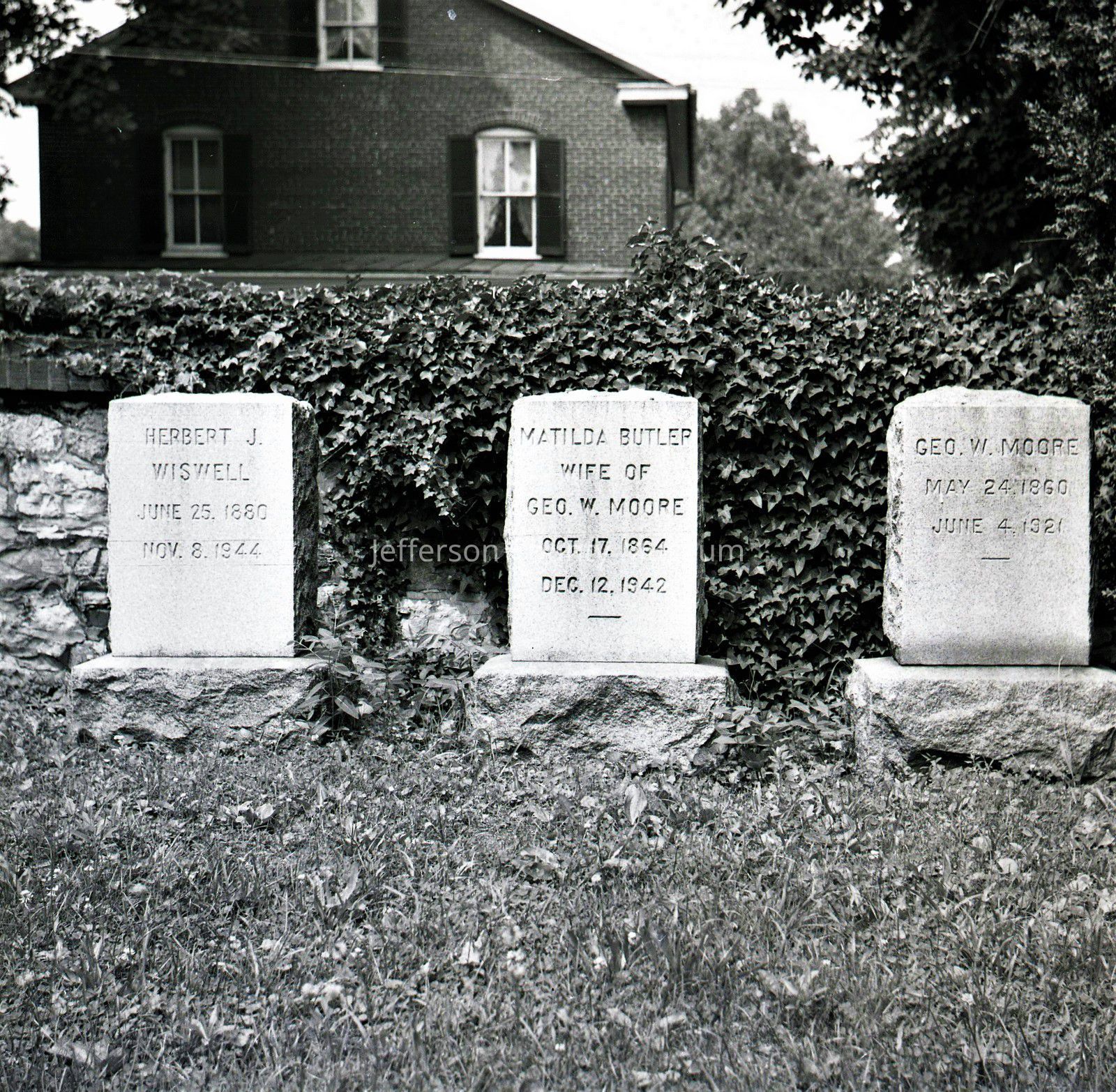 ARC969-15: Herbert J. Wiswell (1880-1944); Matilda Butler Moore(1864-1942), wife of George W. Moore; and George W. Moore (1860-1921) headstones