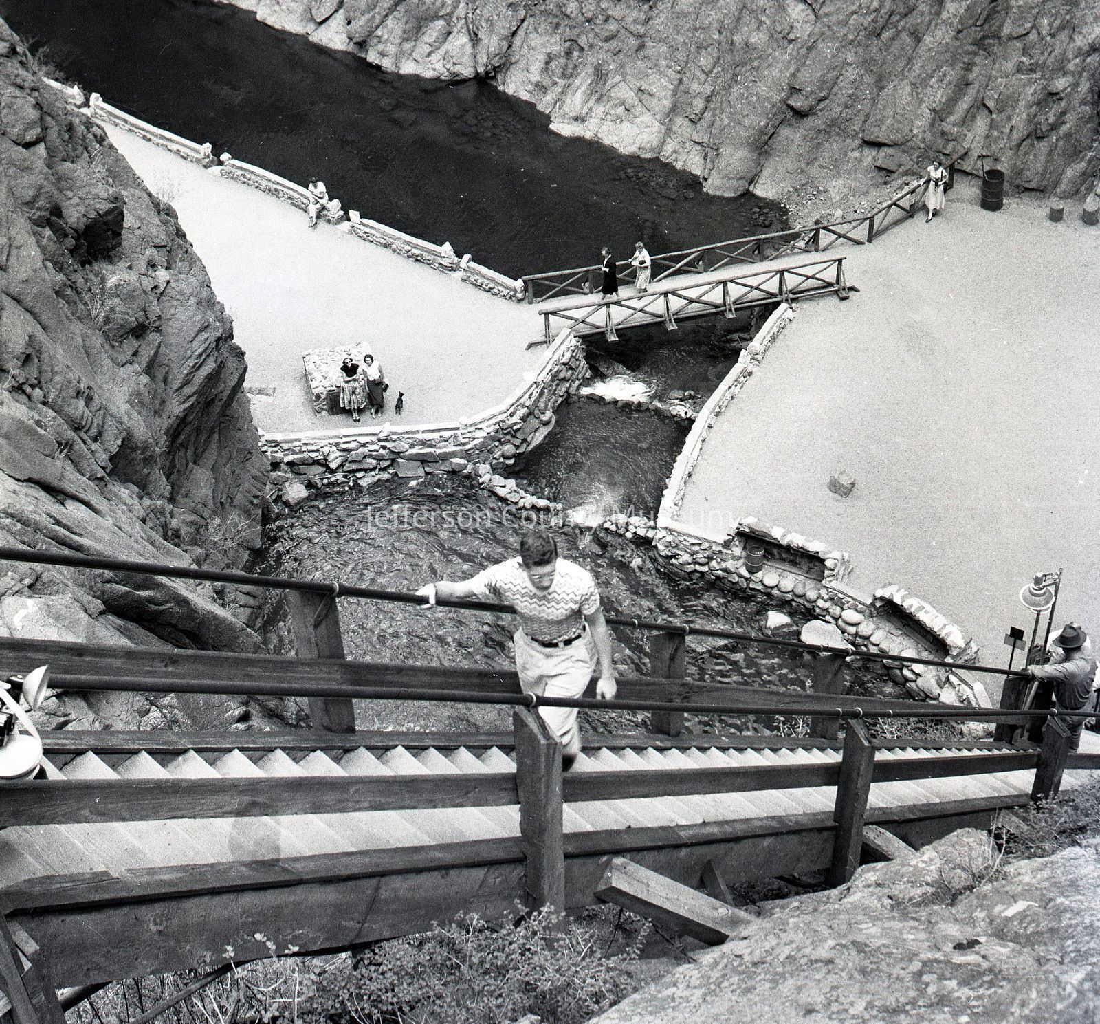 ARC969-17: Wooden steps near rocks and water. Likely a tourist destination. Visitors standing on steps and ground.