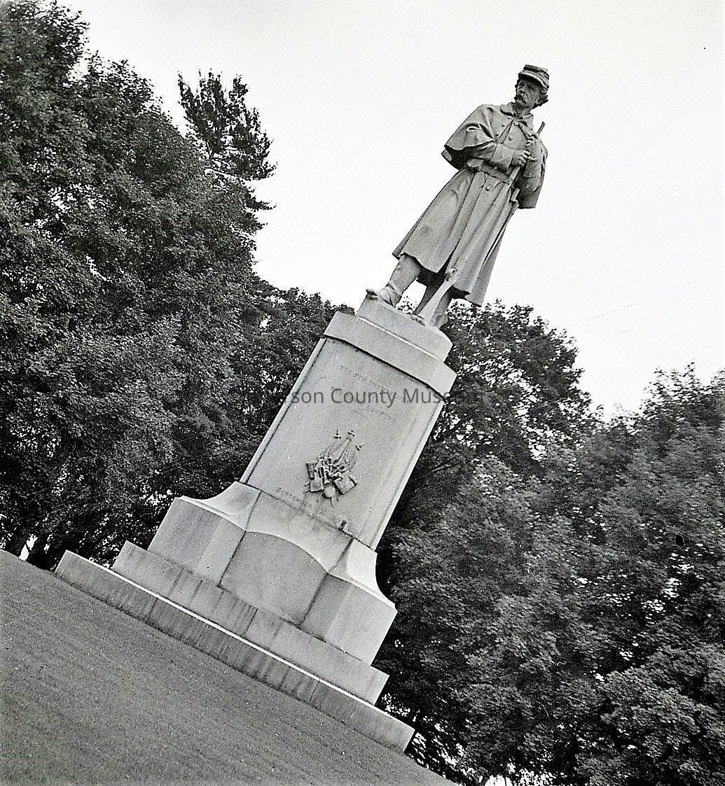 ARC969-25: Monument statue of soldier. Engraved on monument is "Not For Their Cause But For Their Country."