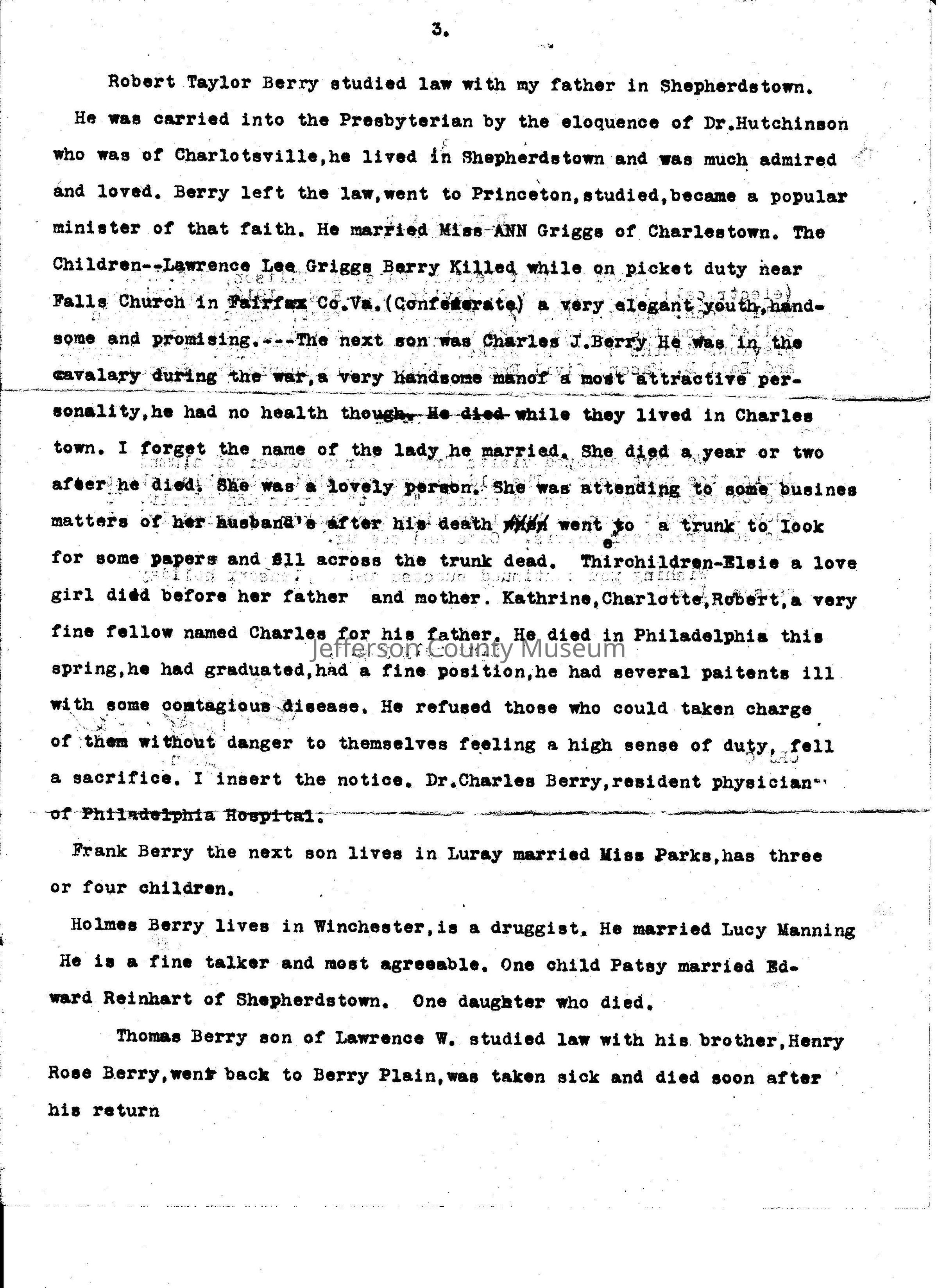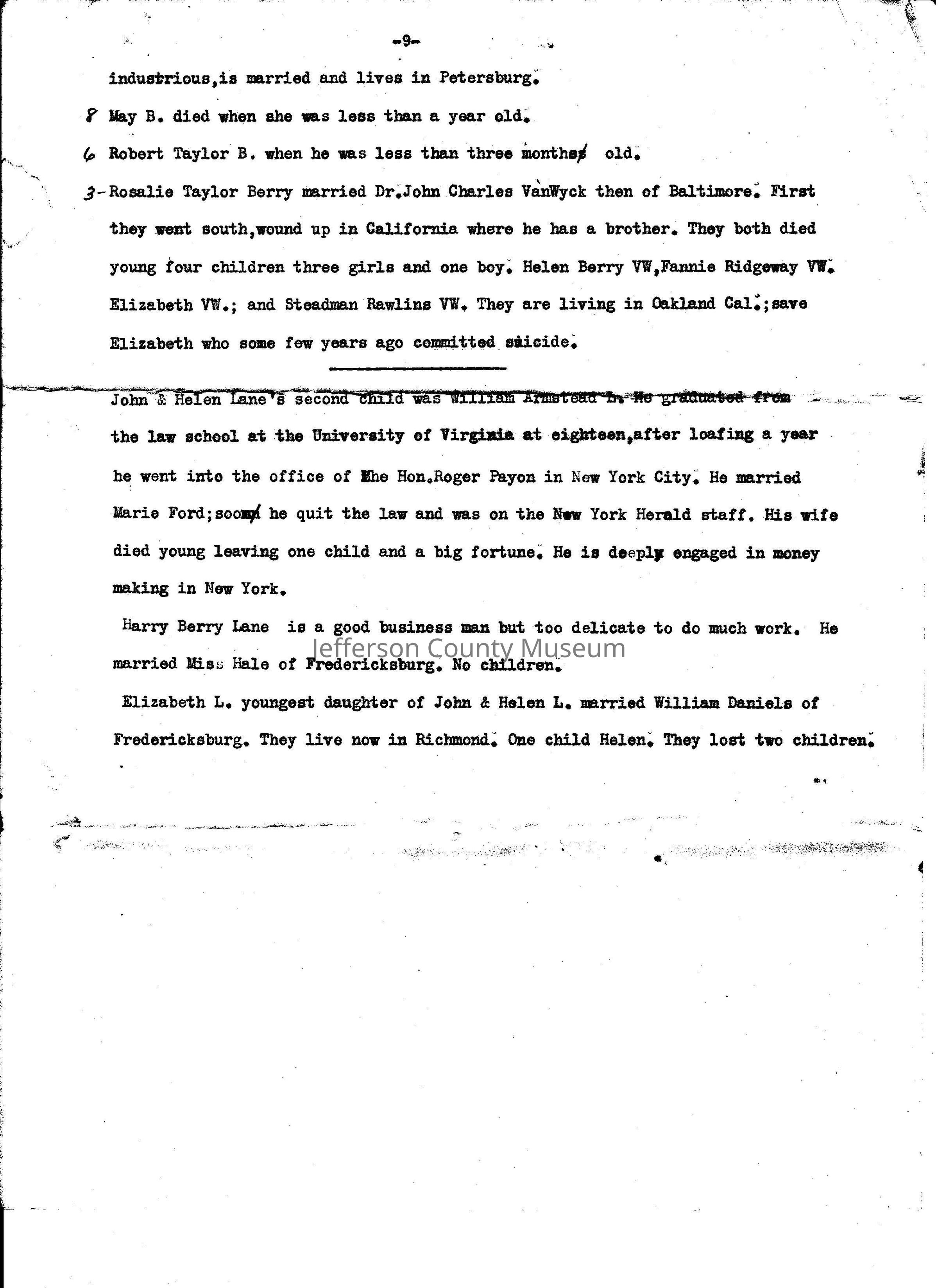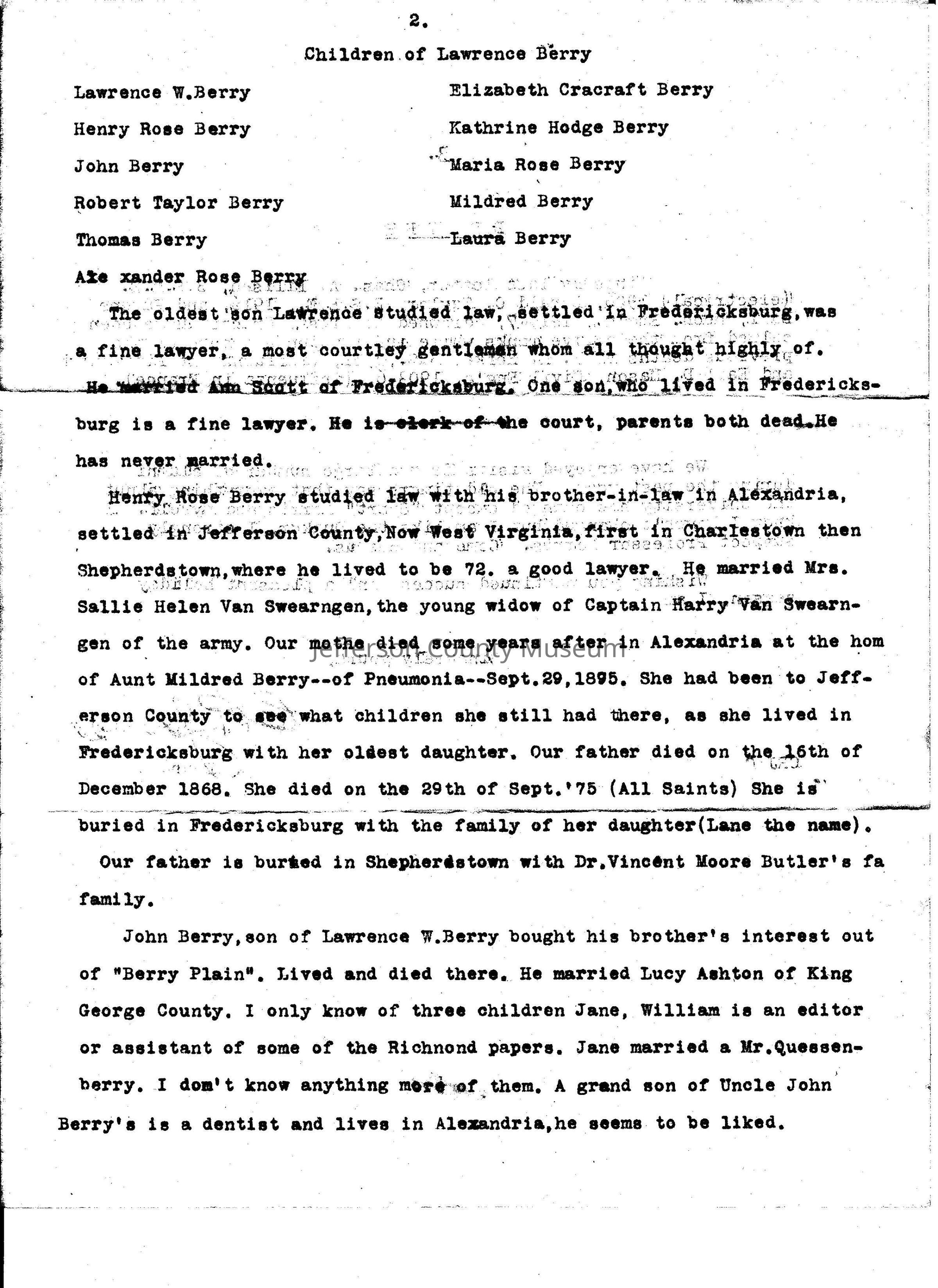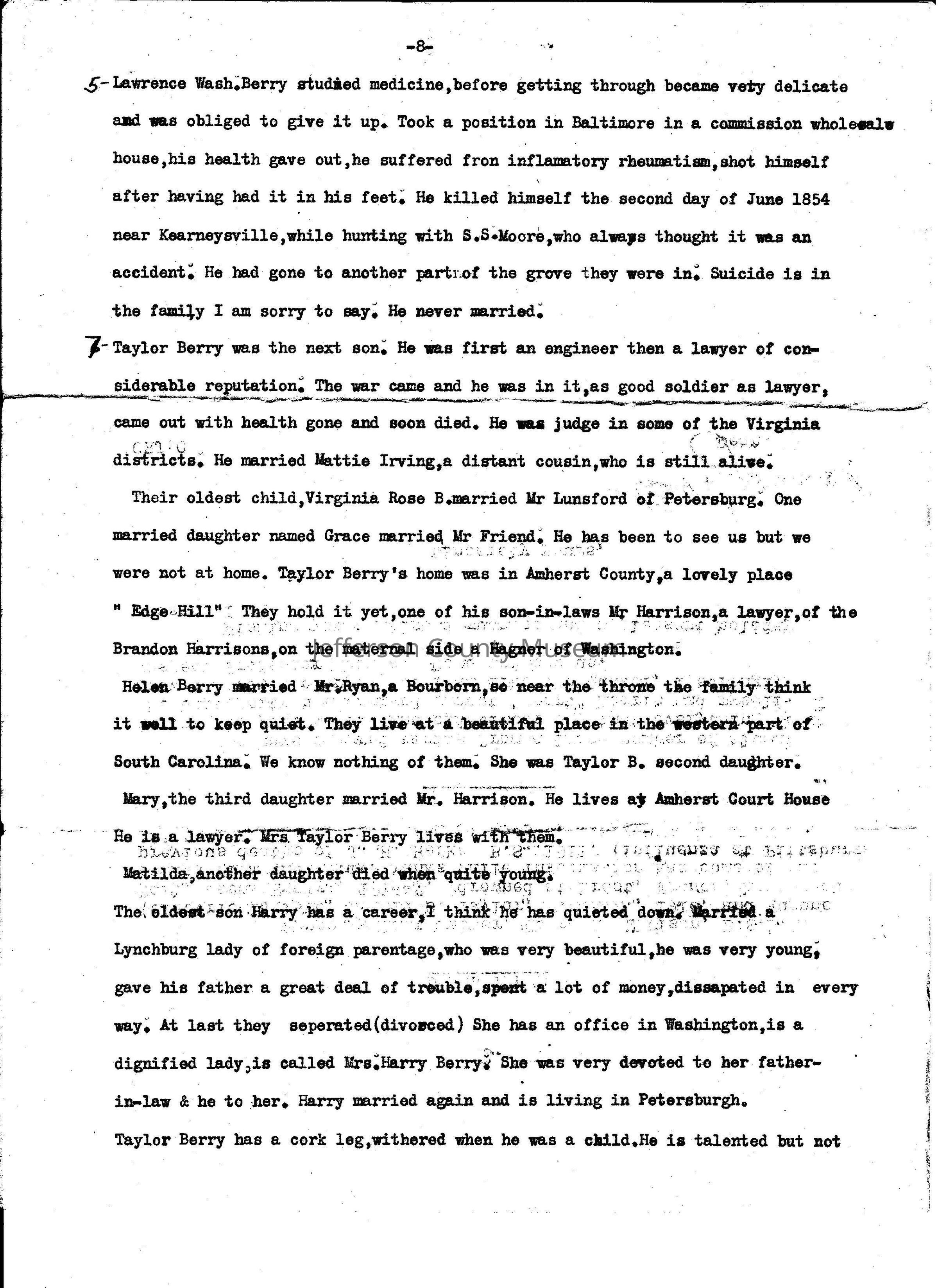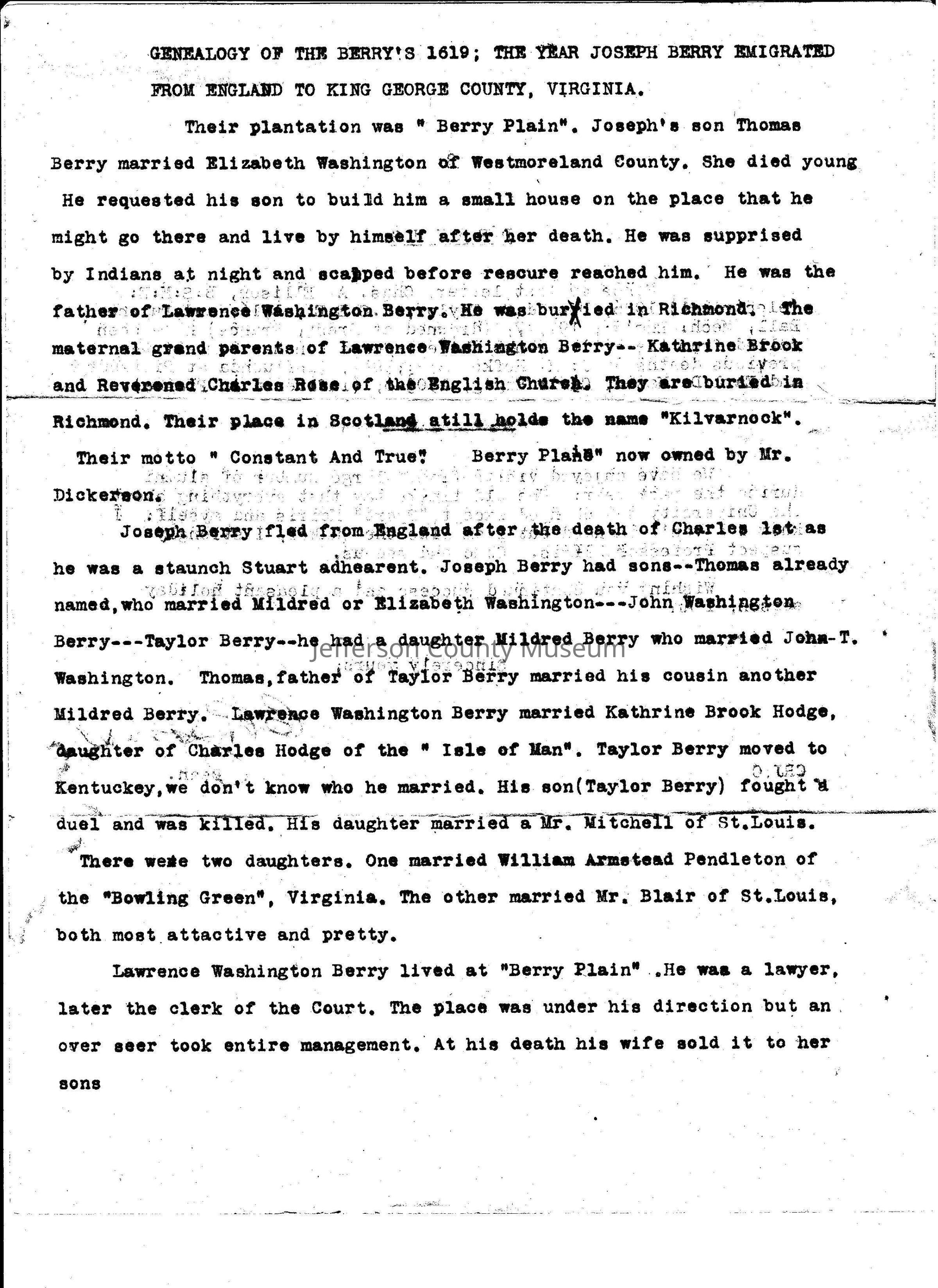 ARC969-28a thru ARC969-28i: "Genealogy of the Berry's 1619; The Year Joseph Berry Emigrated from England to King George's County, Virginia," 9 pages. (Additional information in Media: