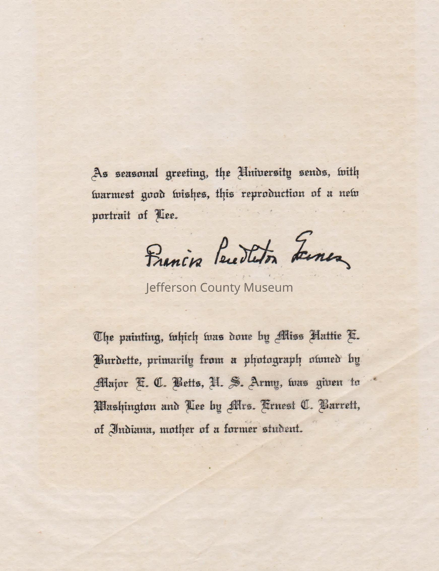 ARC969-36a and ARC969-36b: Photograph of painting of General Robert E. Lee. The painting was done by Hattie E. Burdette, primarily from a photograph owned by Major E. C. Betts, H. S. Army, and was given to Washington and Lee by Mrs. Ernest C. Barrett, of Indiana.