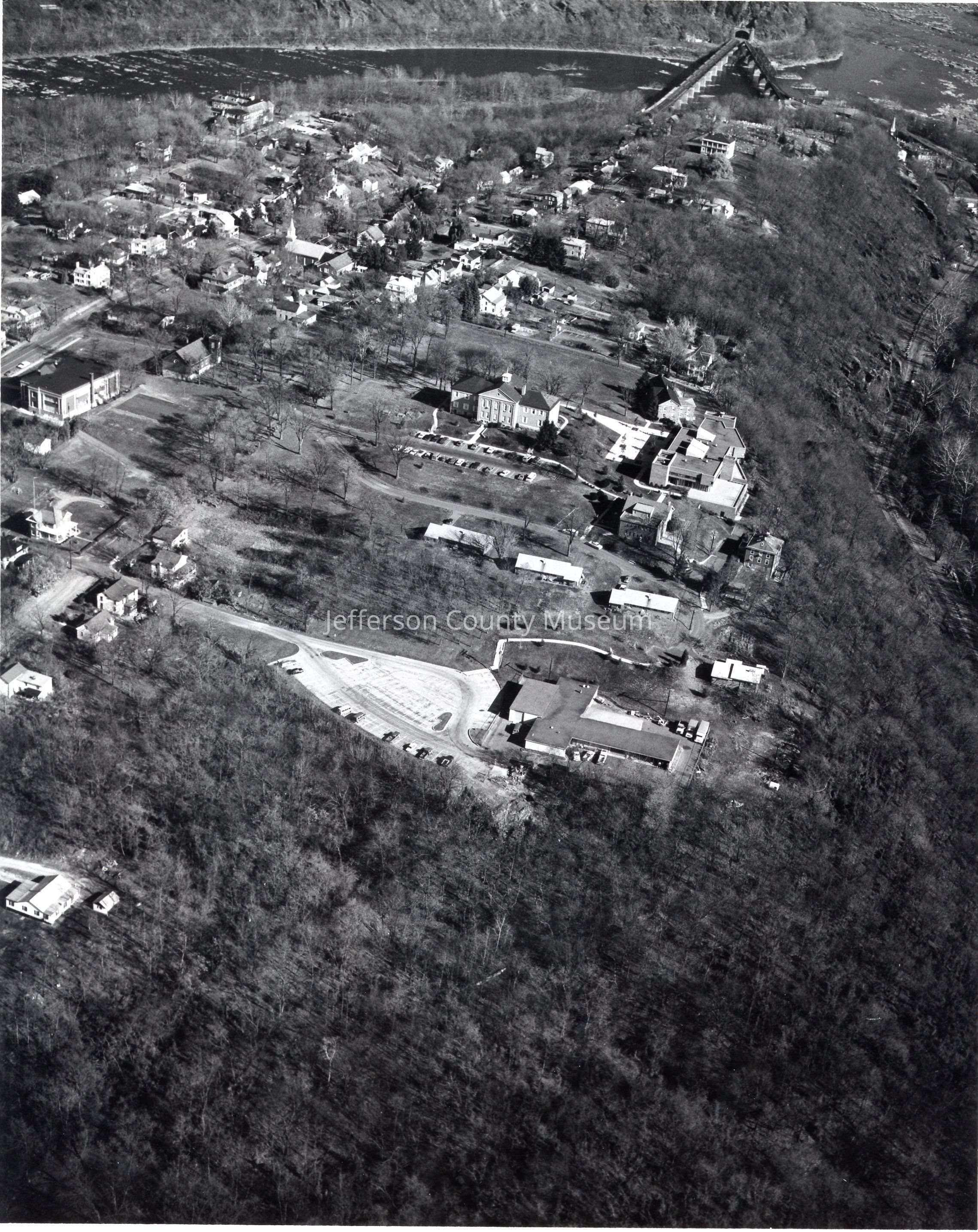 Aerial view of Camp Hill. Mather Training Center (Anthony Hall) in center of picture, Potomac River, and B&O Railroad Bridge at the top.