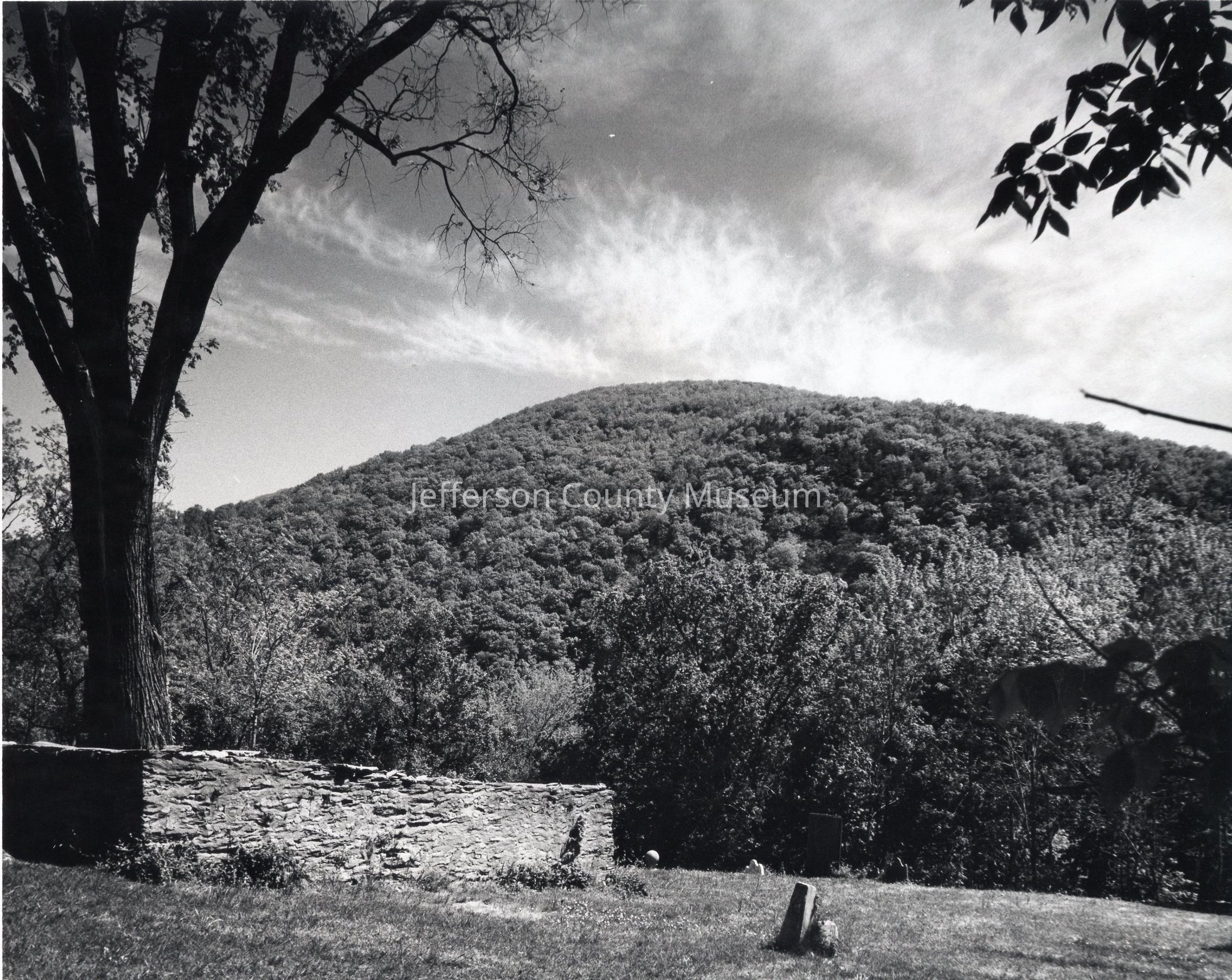 View of Harper Cemetery. Grave of Robert Harper and members of the Wager family in the stone-walled area. Maryland Heights in the background.