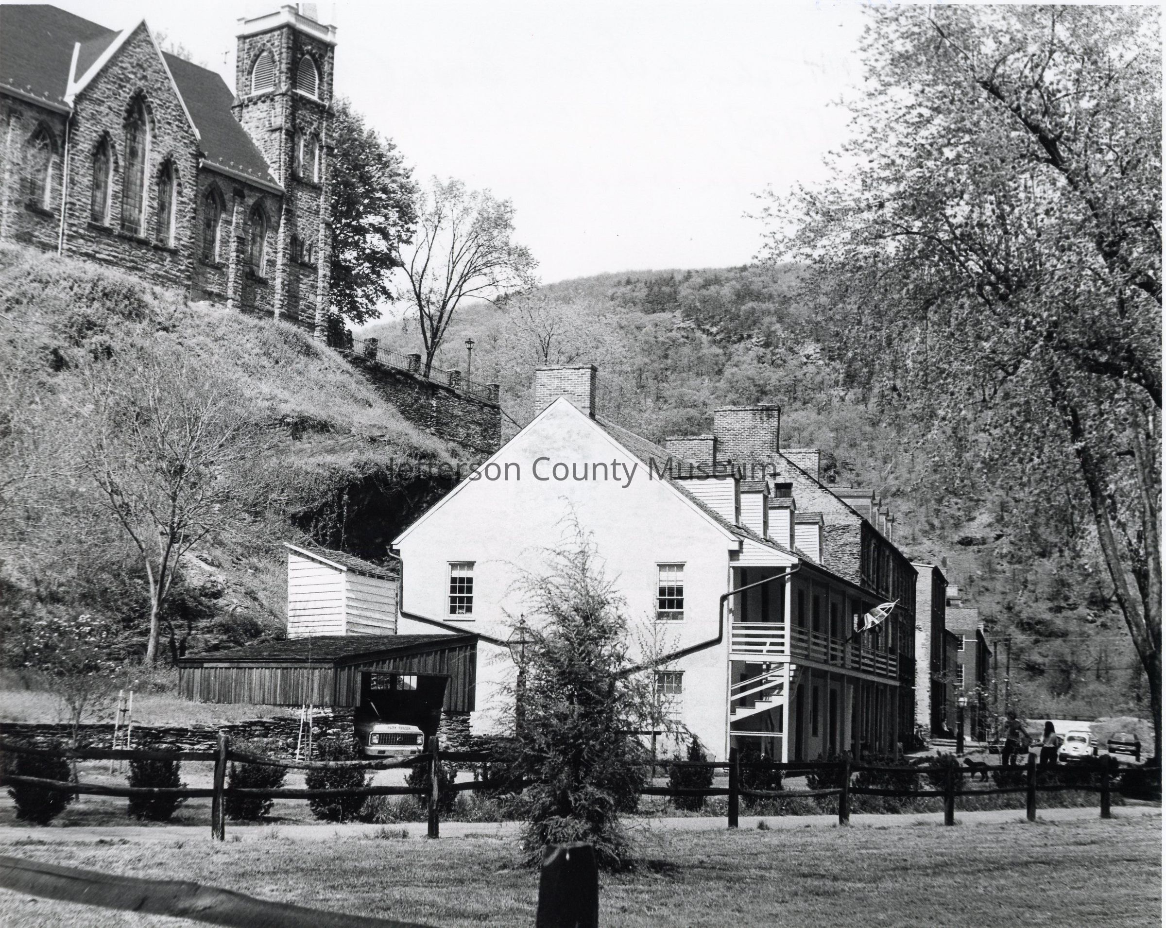 John G. Wilson building on Shenandoah Street [housing Stage Coach Inn; Park Visitor Center, and Park Bookshop in 2013]; St. Peter's Catholic Church in upper left corner.