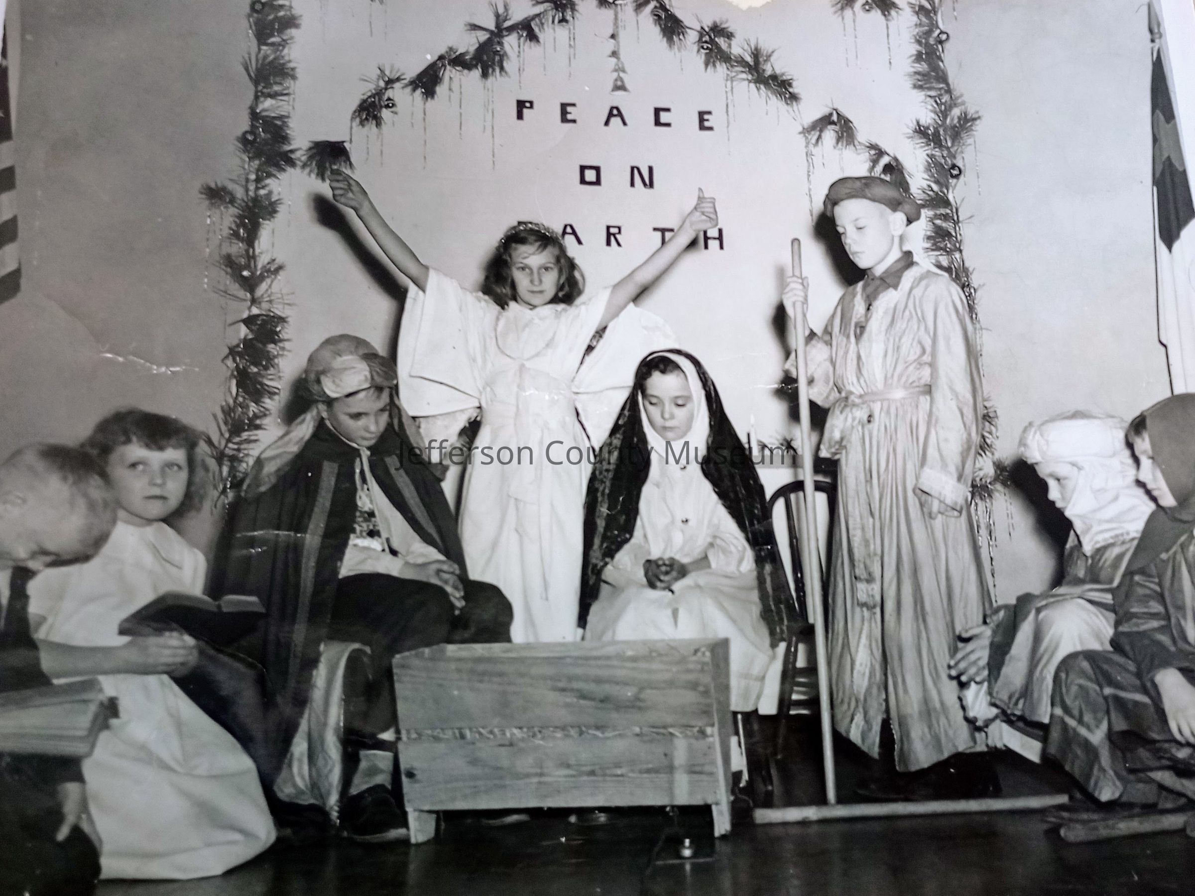 Names of participants, written on back are as follows. "Sonny Bush, Patsy Clipp, Bobby Bush (Joseph), Mary Ann Carroll (Angel), Nancy Clipp (Mary), Charles Langdon, Danny Clipp, Harry M. Kable (Shepherds) Decorations- Mrs. Mary Lombro and Nelson White, Mrs. Clarence Smallwood-(Dir.)Acquisition