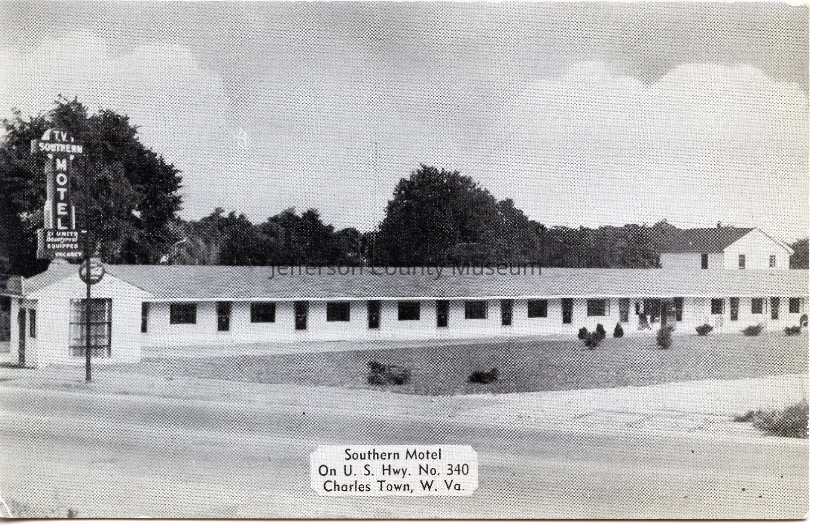 Southern Motel On U.S. Hwy. No. 340 Charles Town, West Virginia: Completely modern motel- beautyrest equipped- radiant heat- television- close to Skylime Drive, Harper's Ferry, and other points of interest- Close to Race Track- Good restaurants within walking distance- Room service- Phone 734. Owned and operated by Mr. and Mrs. Chas C. MarcusAcquisition