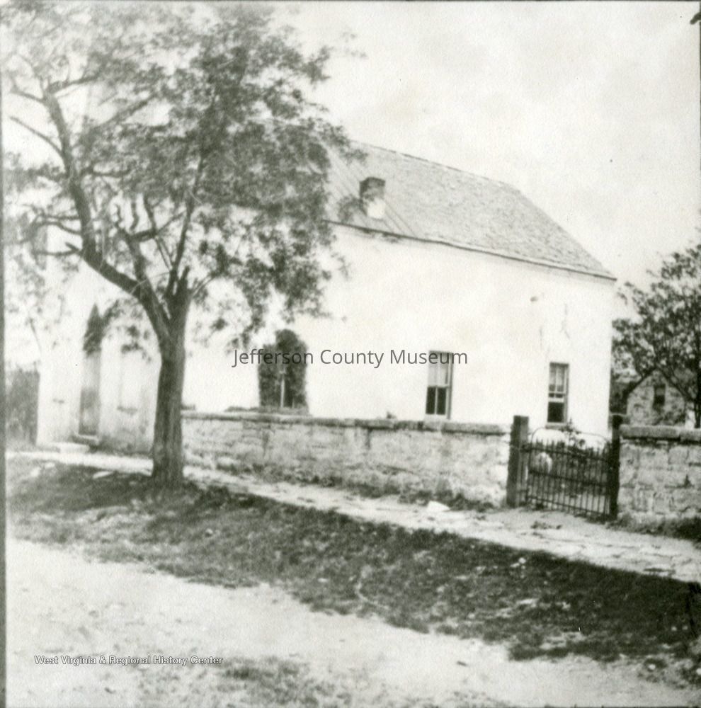 Black and white photo of a side view of the AME church in Shepherdstown.