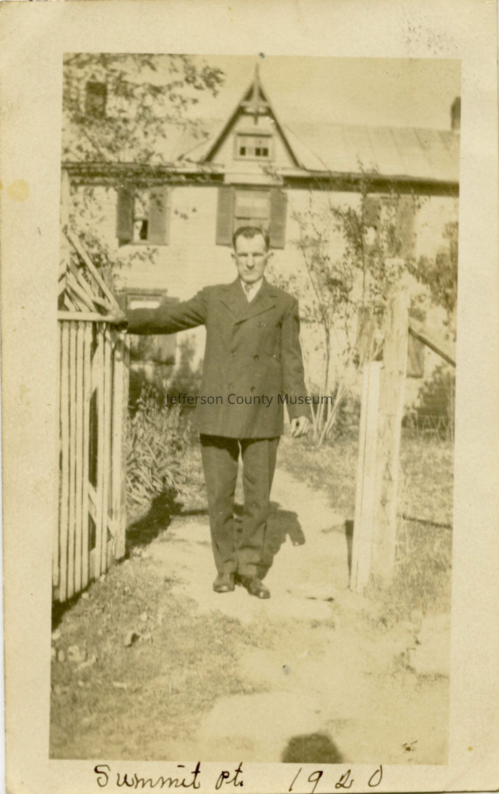 Black and White photo of Will Kelican in front of a home at Summit Point. He is standing in a suit with his hand resting against a gate.Acquisition
