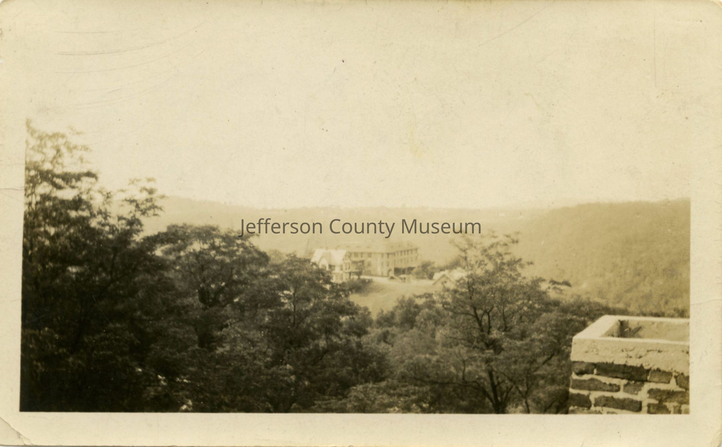 Black and White photo of the HIlltop House with trees and a chimney in the foreground and mountains in the background. Image was taken from the roof of the Lockwood House.Acquisition