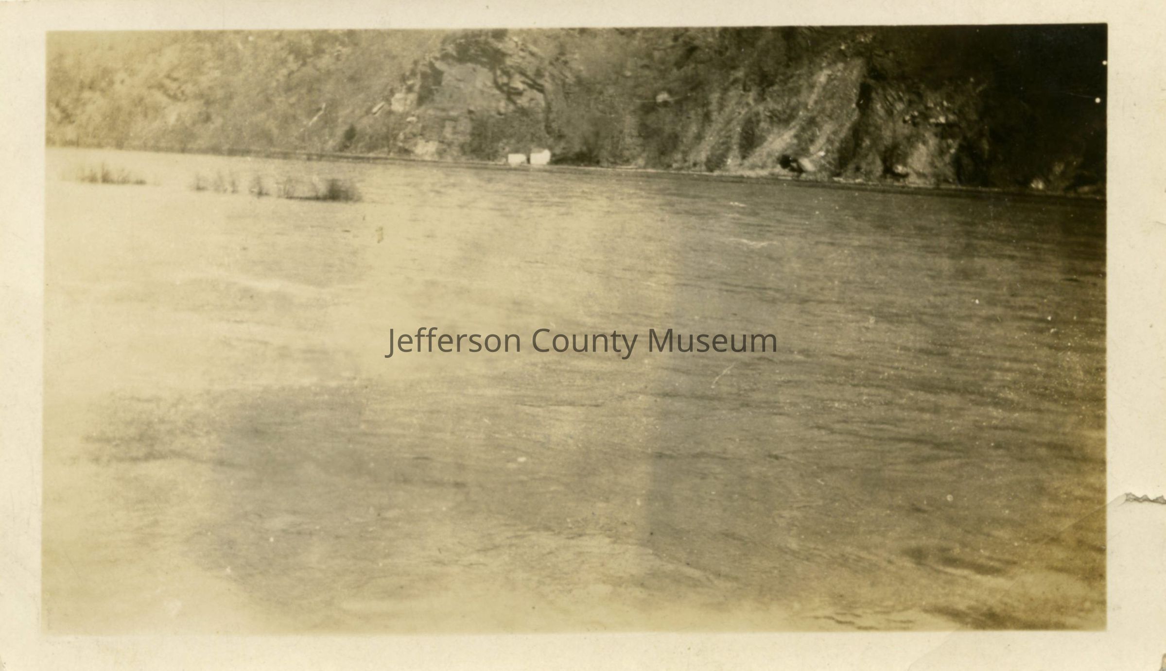 Black and white photo of high waters in front of a mountain with two structures visible on the shore, likely taken looking across from West Virginia to the Maryland side of the river. Note on the back says "Potomac during first flood. March 30, 1924."Acquisition