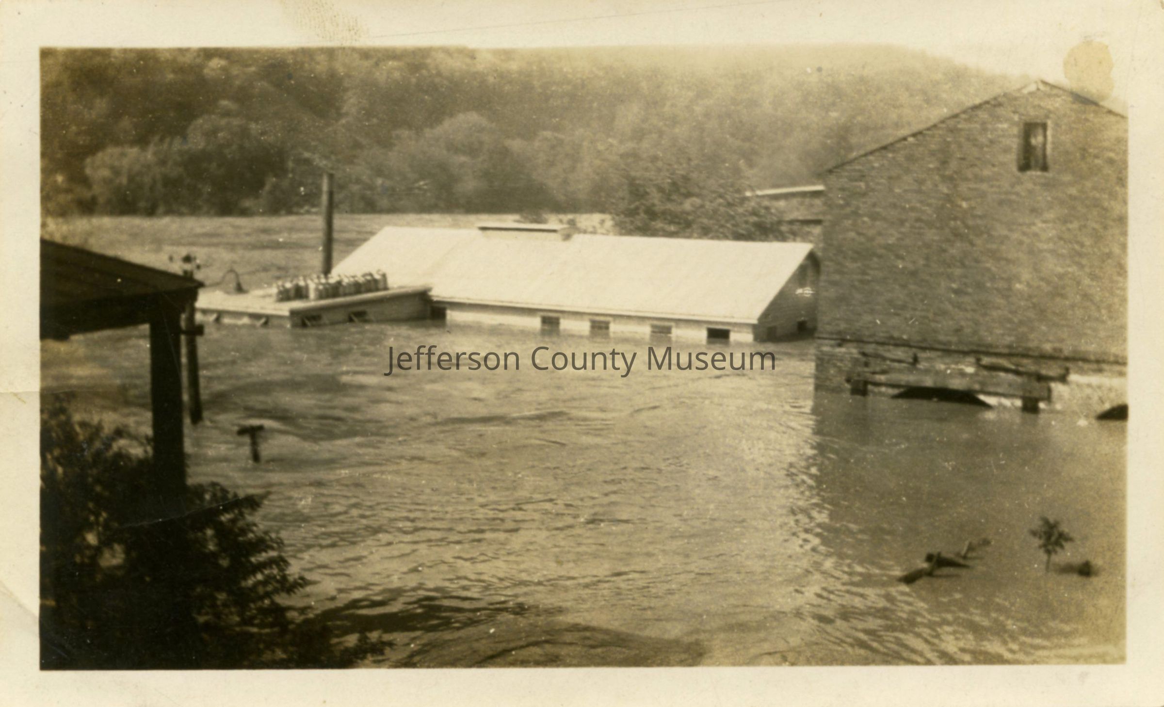 Black and white photo of the creamery during the flood of 1924. A few trees can be seen above the water along with tops of buildings. Note on back lists the date as May 13 and says "Cremary along trusseling."Acquisition