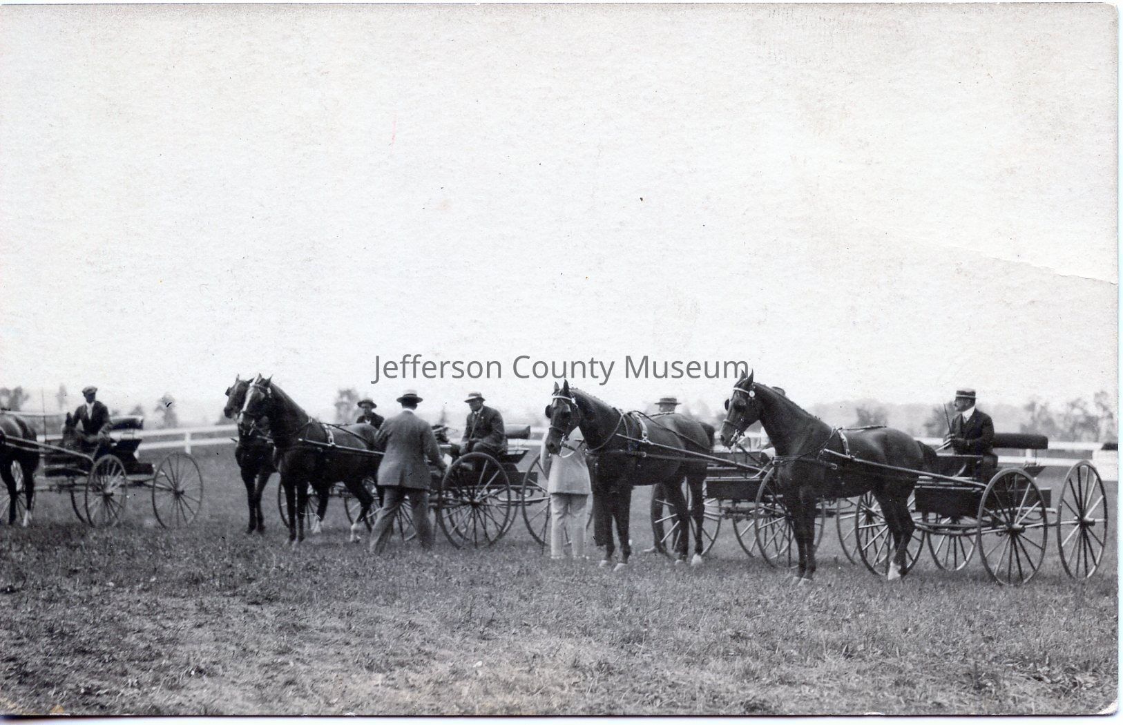 Horses, drivers, and carts at the Charles Town Horse Show. Written on reverse, "Judging driving horses at Charles Town, West Virginia Horse Show."Acquisition