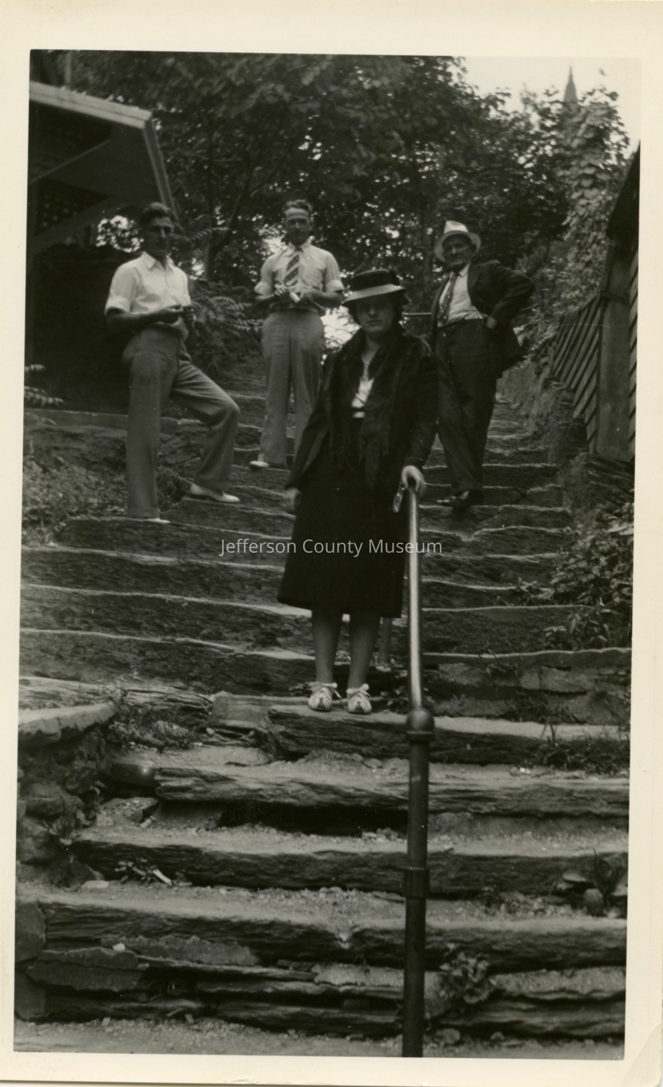 Black and white photo taken looking upward from the stone Steps in Harpers Ferry. In foreground is Thelma Daly (b. 3/25/1906), and behind her are Charles Kelican (m. 4/1934), Ollie Daly, and Will Kelican (d. 1951). St. Peter's steeple is visible in background.Acquisition