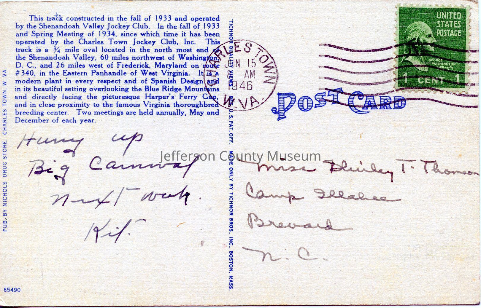 Charles Town Jockey Club, Inc., Charles Town, West Virginia: This track constructed in the fall of 1933 and operated by the Shenandoah Valley Jockey Club. In the fall of 1933 and the Spring Meeting of 1934, since which time it has been operated by the Charles Town Jockey Club, Inc. This track is a 3/4 mile oval located in the northmost end of the Shenandoah Valley, 60 miles northwest of Washington, D.C., and 26 miles west of Frederick, Maryland on route #340, in the Eastern Panhandle of West Virginia. It is a modern plant in every respect and of Spanish Design and in its beautiful setting overlooking the Blue Ridge Mountains and directly facing the picturesque Harper's Ferry Gap, and in close proximity to the famous Virginia thoroughbred breeding center. Two meetings are held annual, May and December of each year.Acquisition