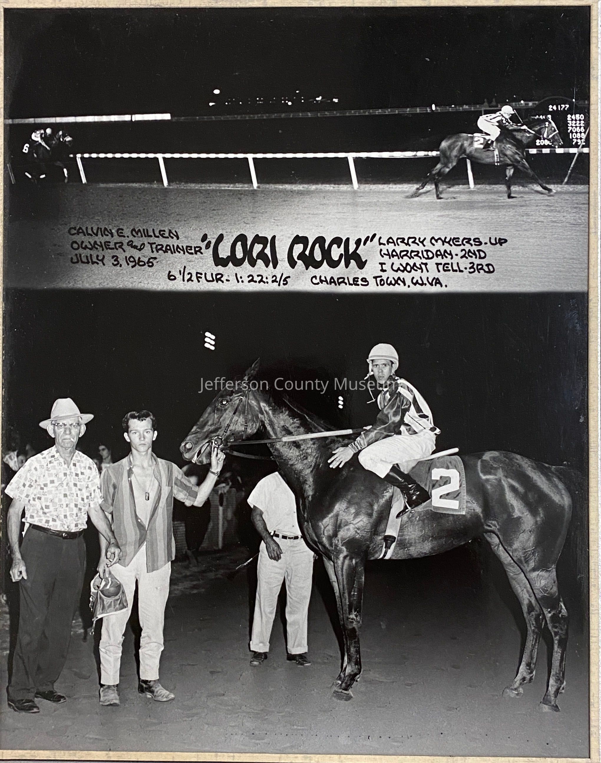 Black and white mounted winners circle photo of "Lori Rock," taken at the Charles Town Race Track. Standing next to the horse are, from left to right, owner/trainer Calvin E. Millen and Jeffrey Welch, and seated on the horse is jockey Larry Myers.Acquisition