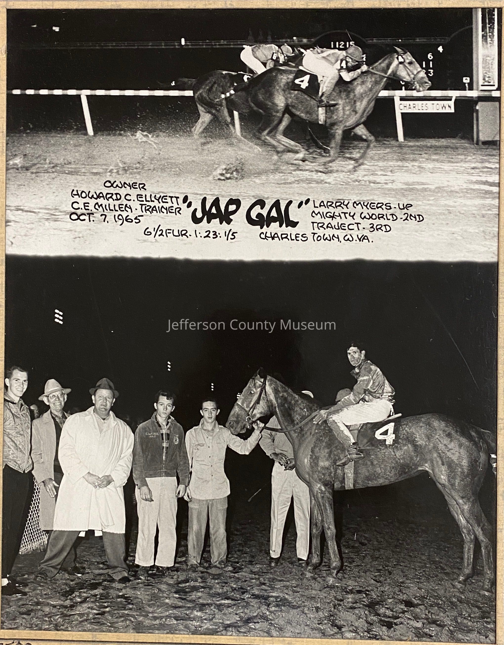 Black and white mounted winners circle photo of "Jap Gal," taken at the Charles Town Race Track. Second from left is trainer Calvin E. Millen, next to him is owner Howard C. Ellyett. Jeffrey Welch holds the reins, and seated on the horse is jockey Larry Myers.Acquisition