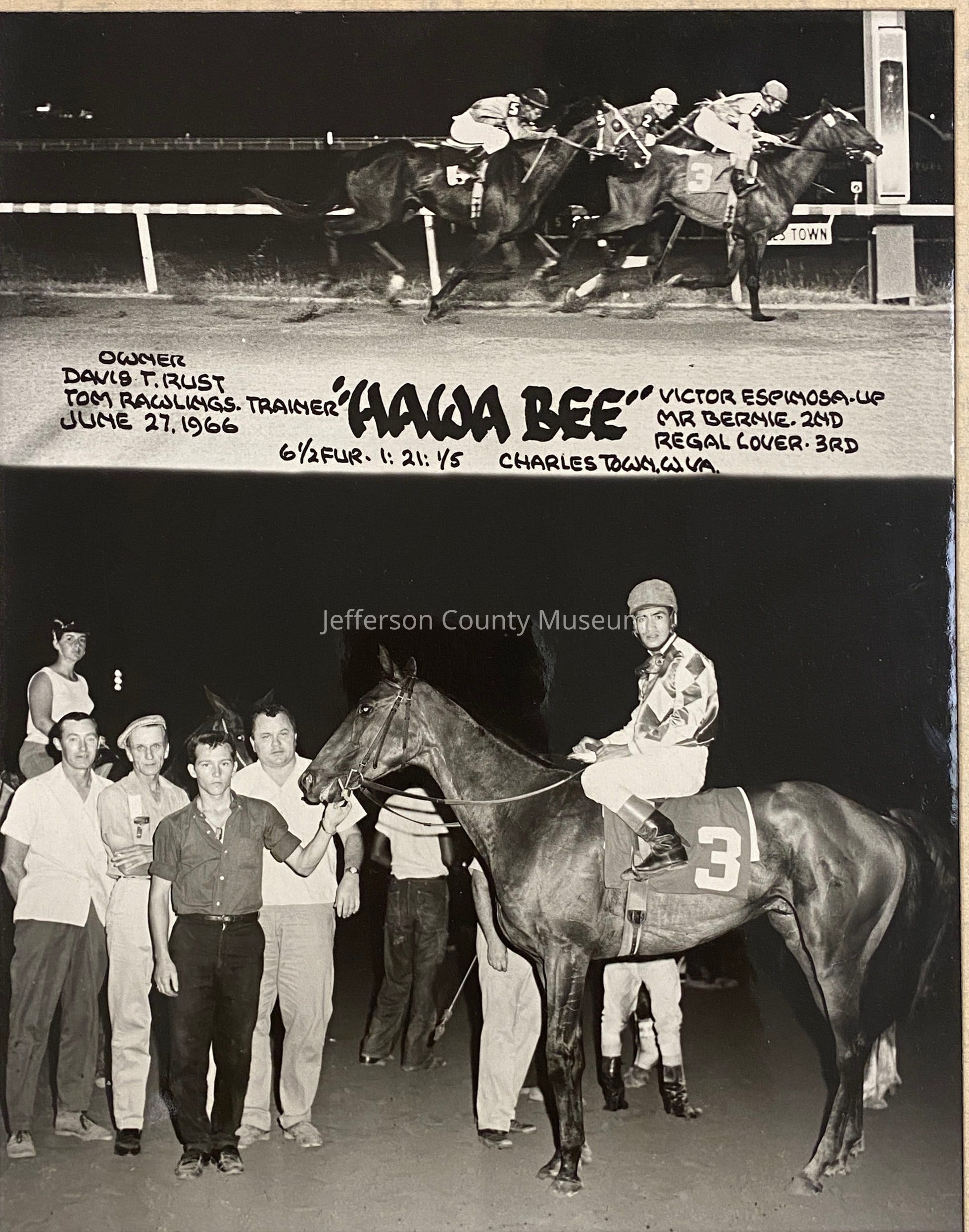 Black and white mounted winners circle photo of "Hawa Bee," taken at the Charles Town Race Track. At far left is trainer Thomas O. Rawlings. Also pictured is owner Davis T. Rust. Jeffrey Welch holds the reins, and jockey Victor Espinosa sits atop the horse.Acquisition