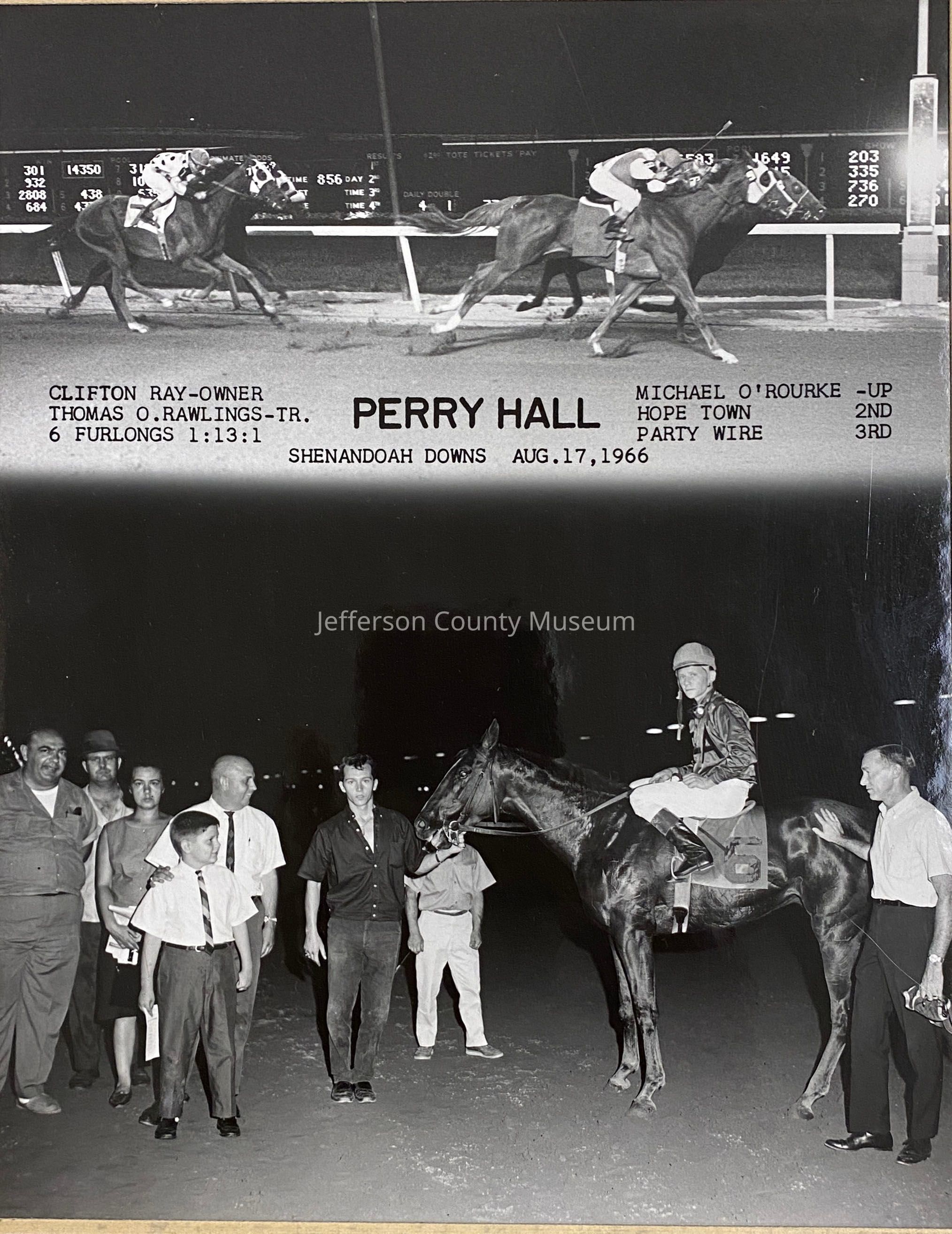 Black and white mounted winners circle photo of "Perry Hall," taken at Shenandoah Downs. On the right is trainer Thomas O Rawlings. Jockey MIchael O'Rourke sits atop the horse and Jeffery Welch holds the rians. Owner Clifton Ray is pictured fourth from the left.Acquisition